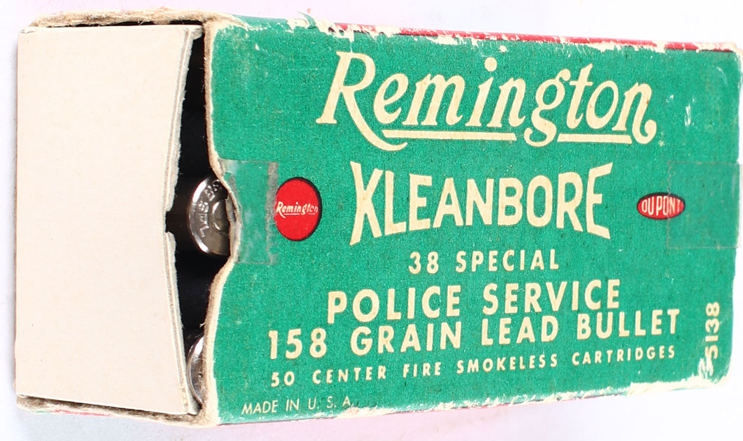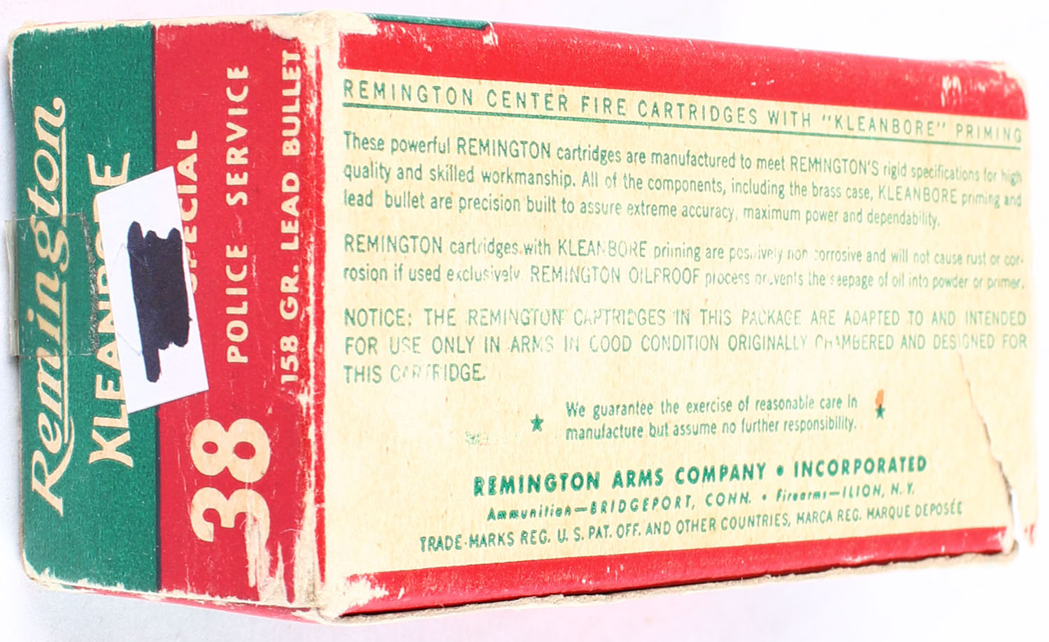 Remington, Kleanbore Police Service, .38 Special, 158 Grain Lead Bullet, Partial 38rds, 1pc. Green buff & red box, box is solid with very good color, left end flap is missing, edge & corner wear, ammo is excellent. Grade: Good ++ - Value: 10 to 30
