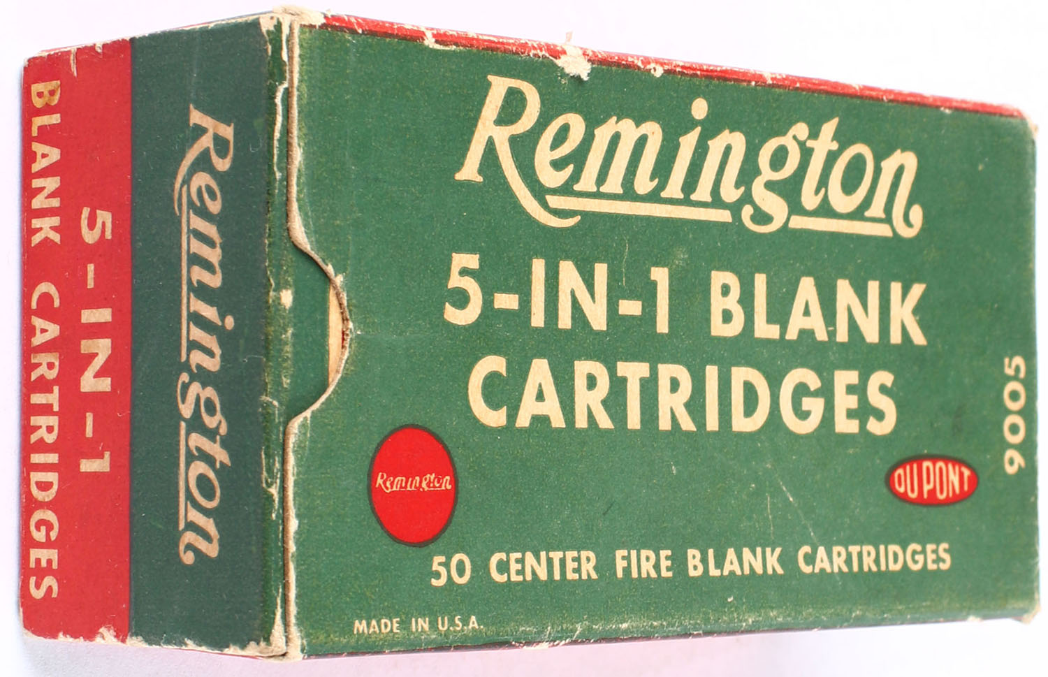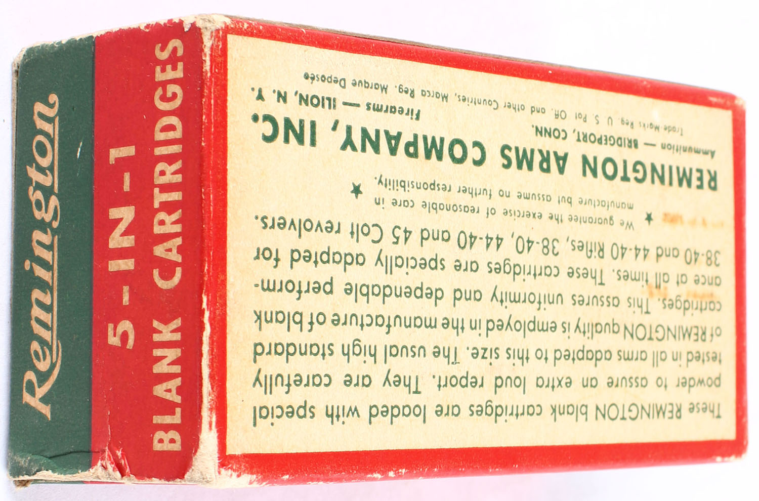 Remington, 5-in-1 Blank Cartridges, Extra Loud Report, Partial 48rds, 1pc. Green white & red box, box has excellent color, minor edge & corner wear, end flaps are solid, ammo is excellent. Grade: Excellent - Value: 20 to 50