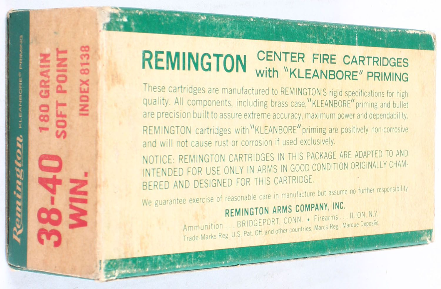 Remington, Center Fire Cartridges, .38-40 Winchester, 180 Grain Soft Point, Partial 40rds, 1pc. Green white & red box, box is solid with excellent color, minor shelf wear, ammo is excellent. Grade: Remington, Center Fire Cartridges, .38-40 Winchester, 180 Grain Soft Point, Full, 1pc. Green white & red box, box is solid with excellent color, minor shelf wear, ammo is excellent. Grade: Very Good ++ - Value: 50 to 150