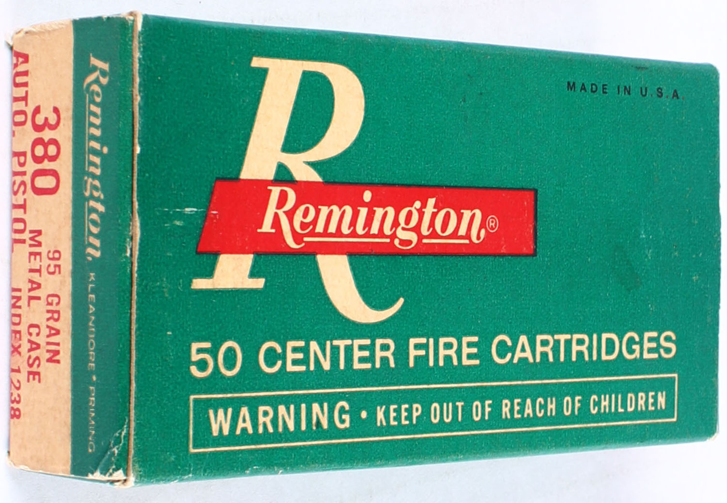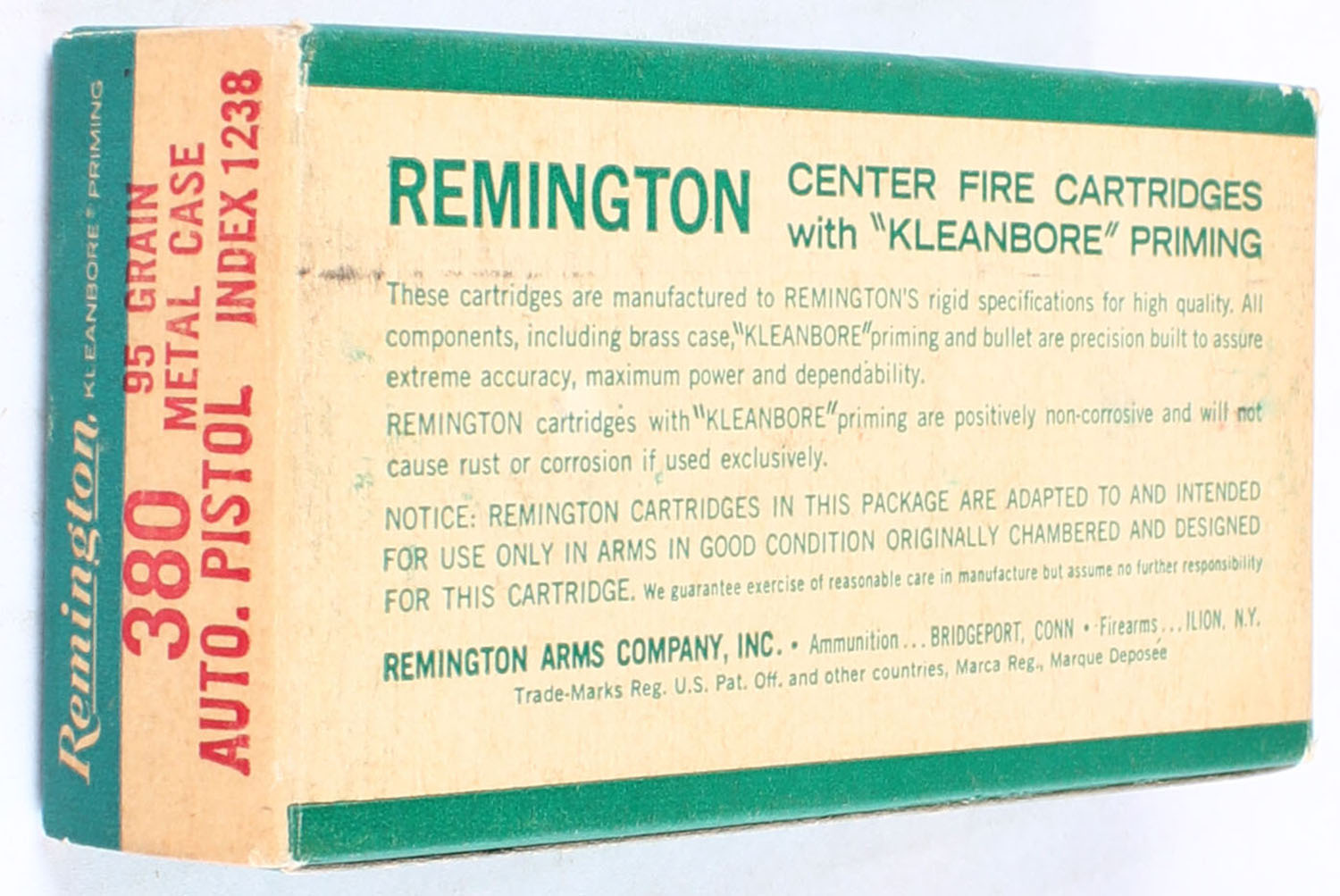 Remington, Center Fire Cartridges, .380 Auto. Pistol, 95 Grain Metal Case, Full, 1pc. Green white & red box, box is very solid with excellent color, ammo is excellent. Grade: Excellent + - Value: 20 to 30