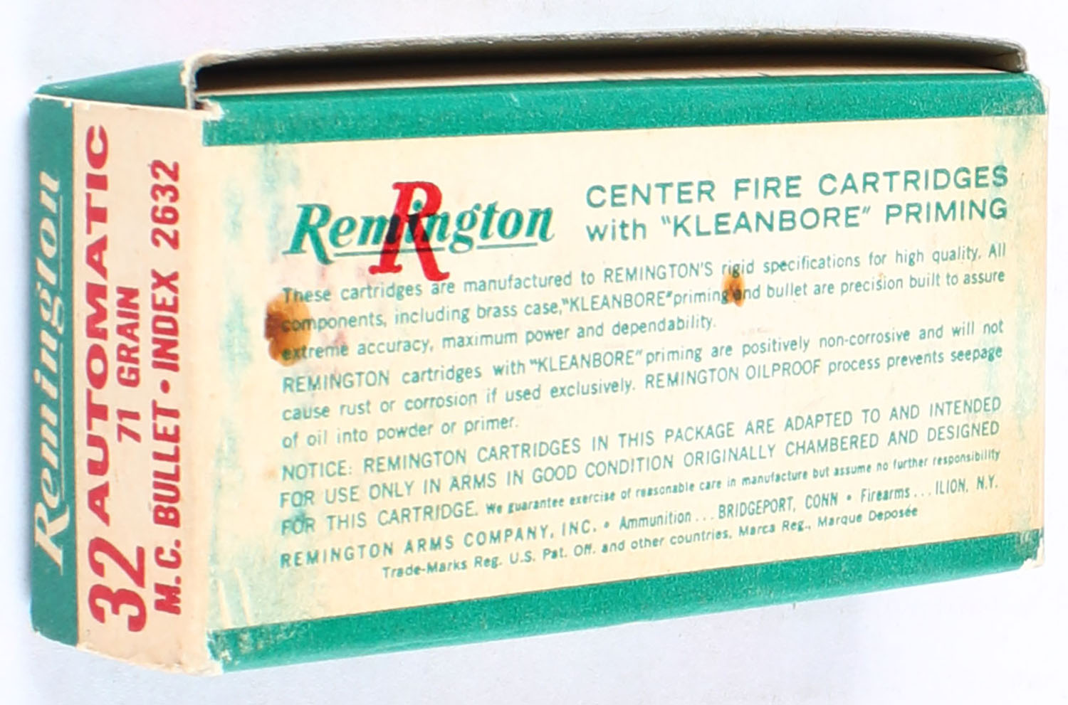 Remington, Center Fire Cartridges, .32 Auto., 71 Grain Metal Case, Full, 1pc. Green white & red box, box is solid with very good color, some age soiling & shelf wear, ammo is excellent. Grade: Very Good ++ - Value: 10 to 30