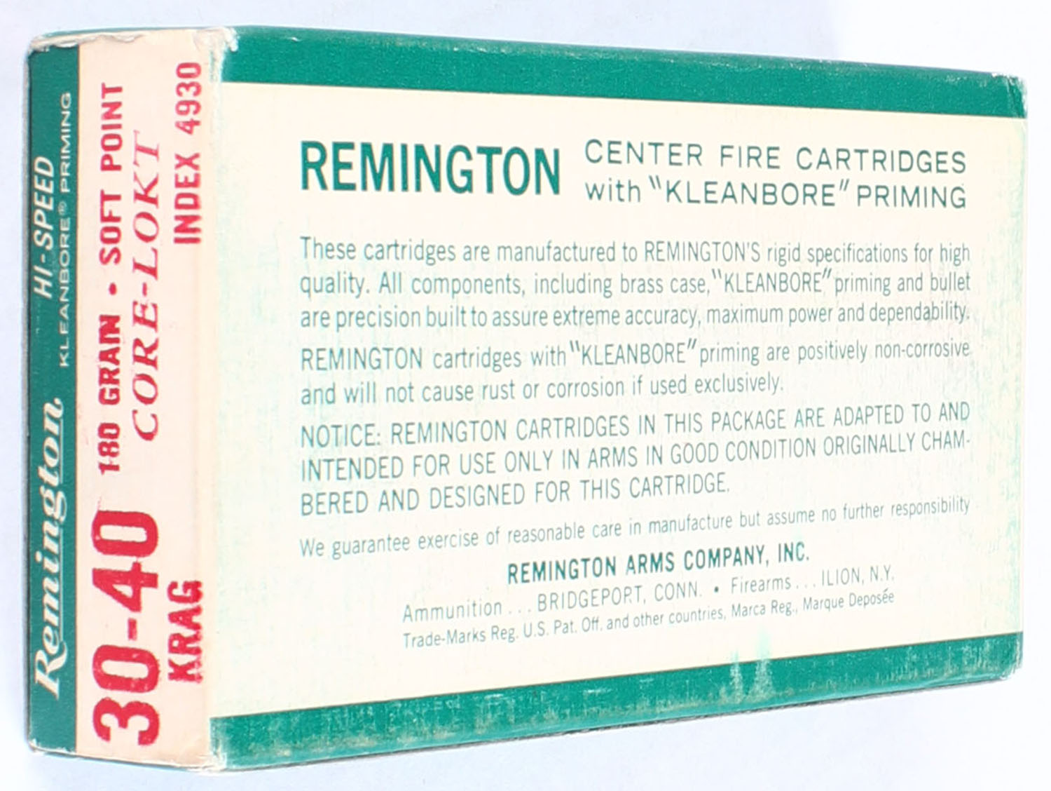 Remington, .30-40 Krag, 180 Gr. PTD Soft point Core-Lokt Bullet, 1pc, Full, Green white & red box, box is solid with great color with light rubbing, ammo is excellent. Grade: Excellent + - Value: 30 to 90
