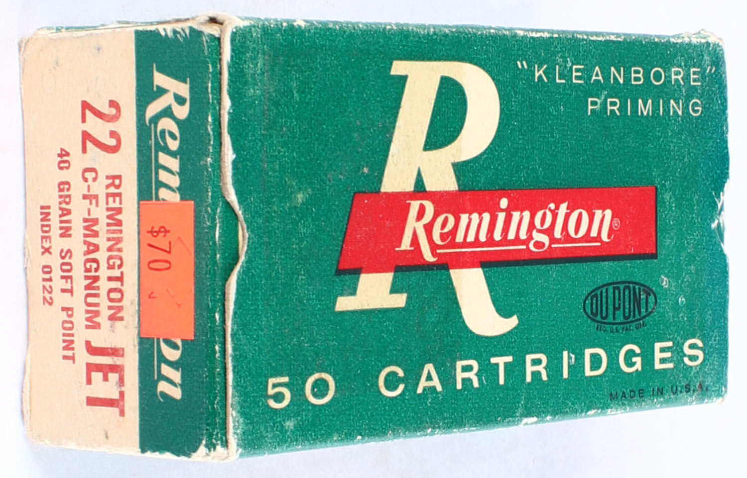 Remington, .22 Remington Jet C-F Magnum, 40 Gr. Soft point Bullet, 1pc, Full, Green white & red box, box has scuffing and edge wear, ammo is excellent. Grade: Very Good ++ - Value: 30 to 90