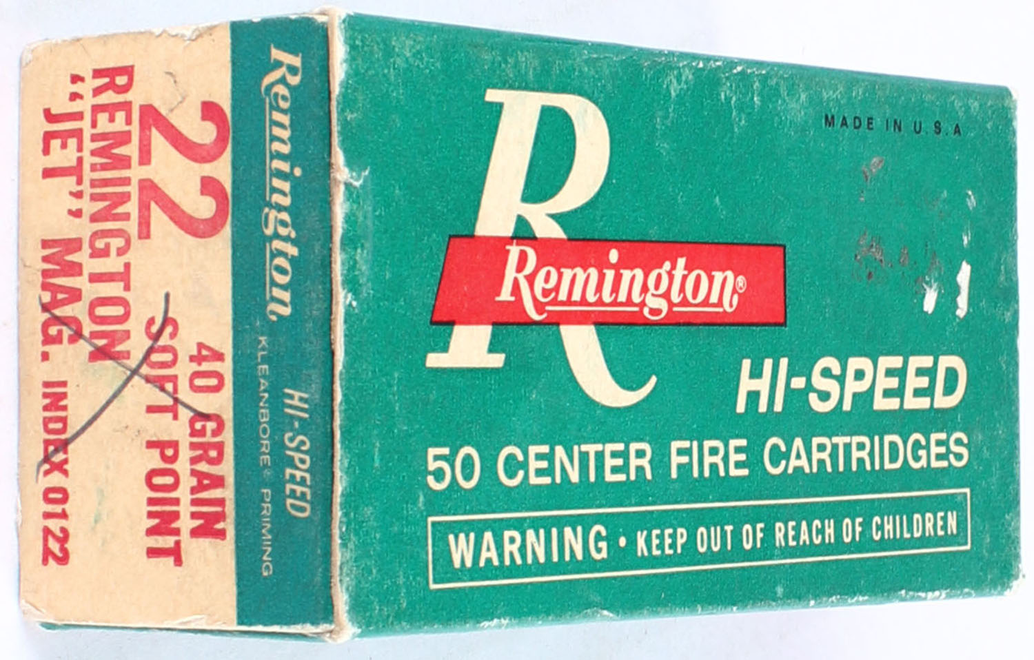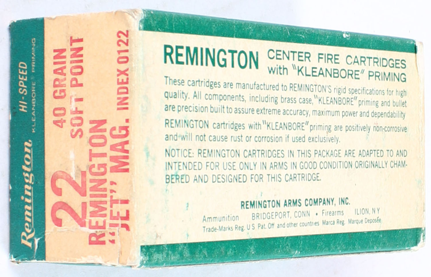 Remington, .22 Remington Jet Mag., 40 Gr. Soft point Bullet, 1pc, Full, Green white & red box, box is solid with some scuffing, ammo is excellent. Grade: Excellent - Value: 30 to 90