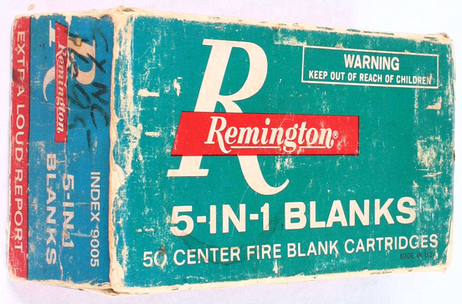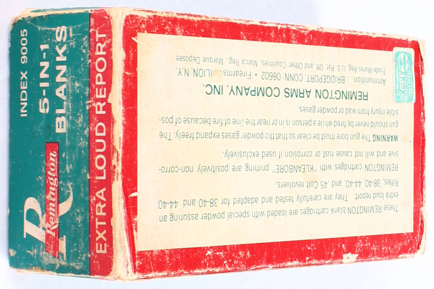 Remington, 5-IN-1 Blanks., 1pc, Partial 48 rds., Green white & red box, has heavy scuffing, ammo is excellent. Grade: Very Good - Value: 30 to 60