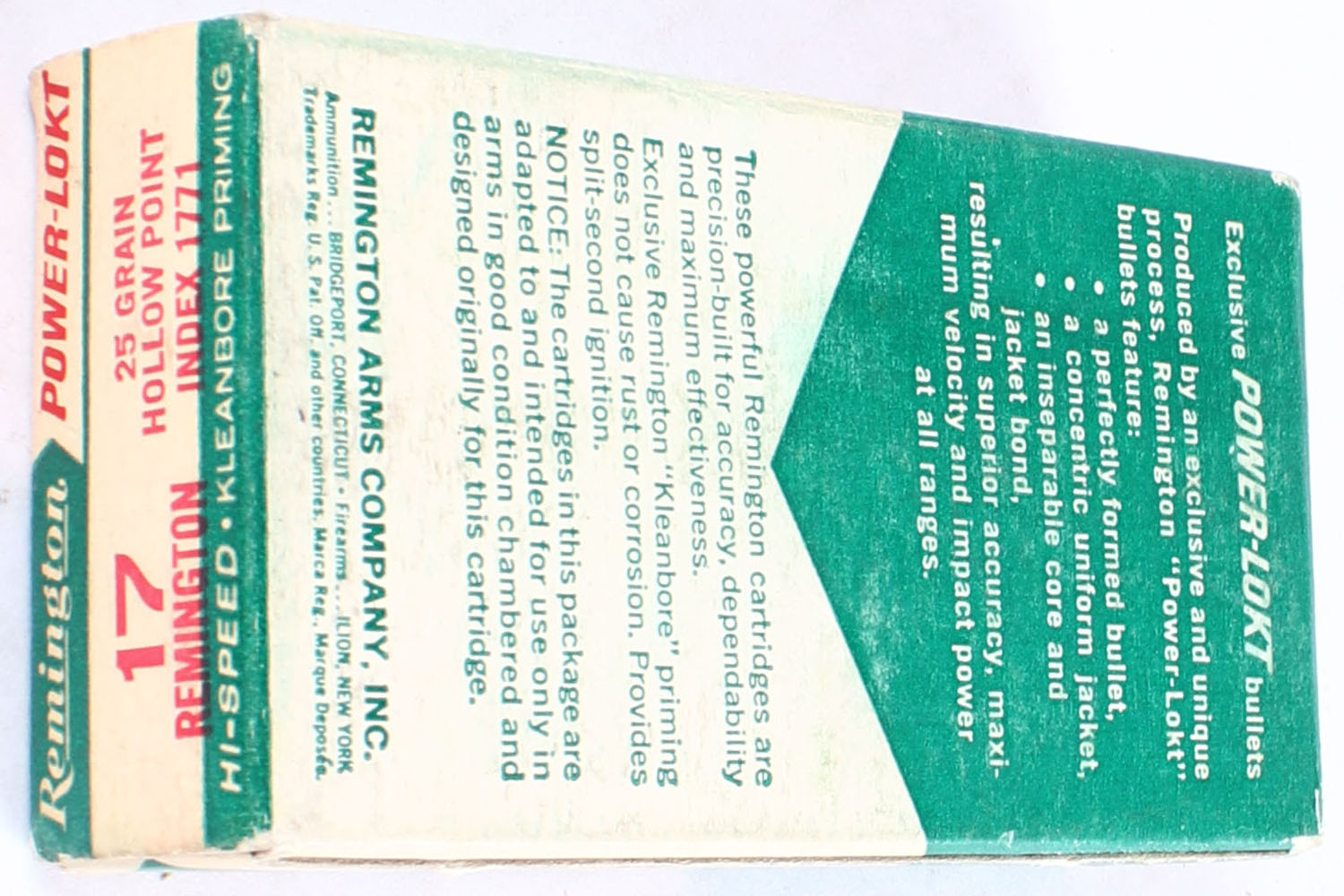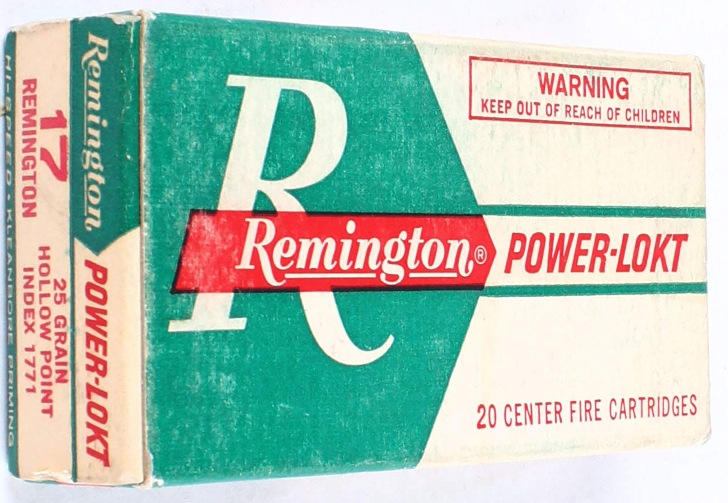 Remington, Power-Lokt, .17 Remington, 25 Grain Hollow Point, Full, 1pc. White green & red box, box has light age soiling, has, ammo is excellent. Grade: Excellent - Value: 30 to 70