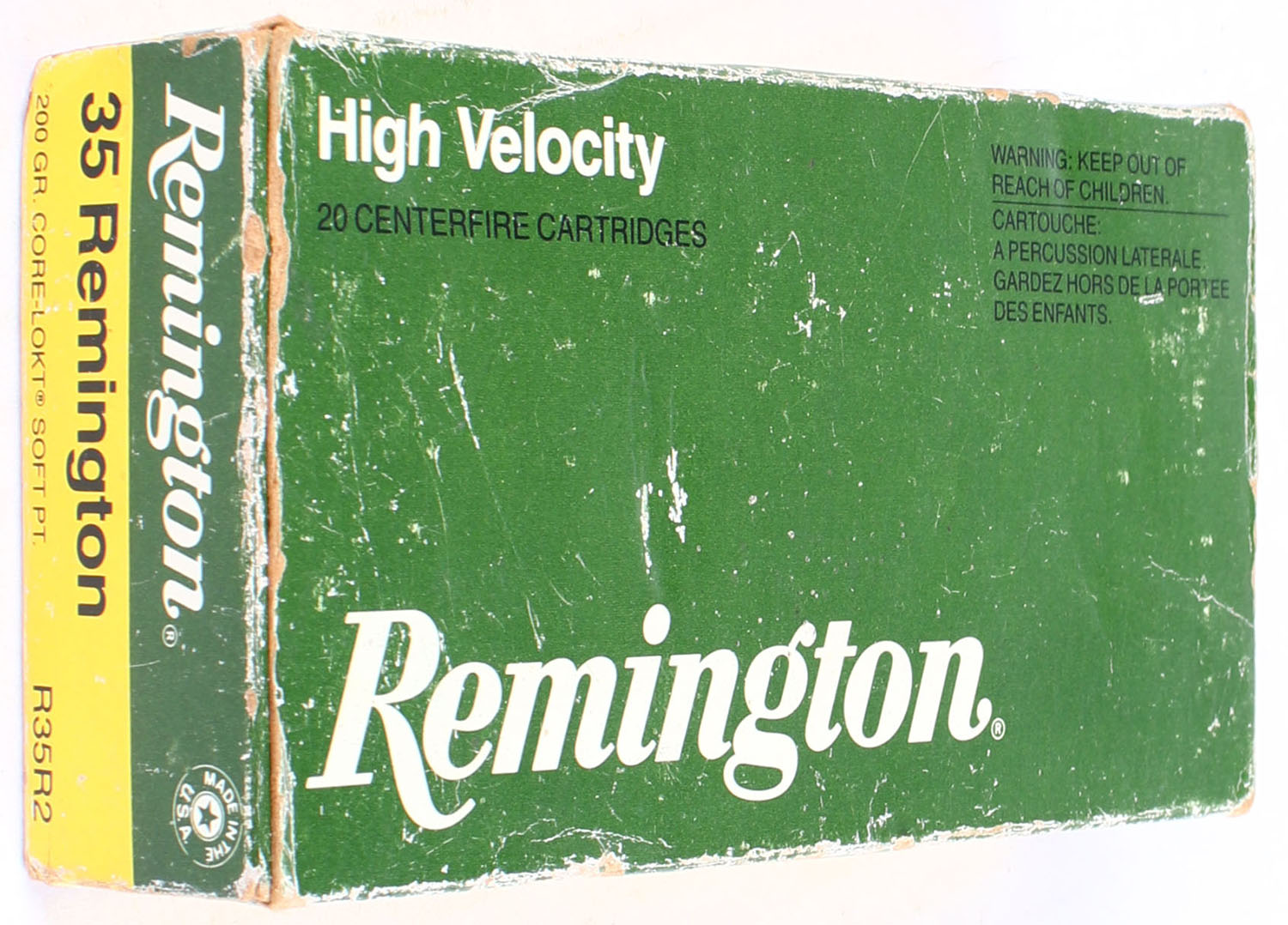 Remington, High Velocity, .35 Remington, 200 grain Core-Lokt soft point, Full, 1pc. Green & yellow box, box has light edge wear, end flaps are solid, ammo is excellent. Grade: Very Good ++ - Value: 20 to 60