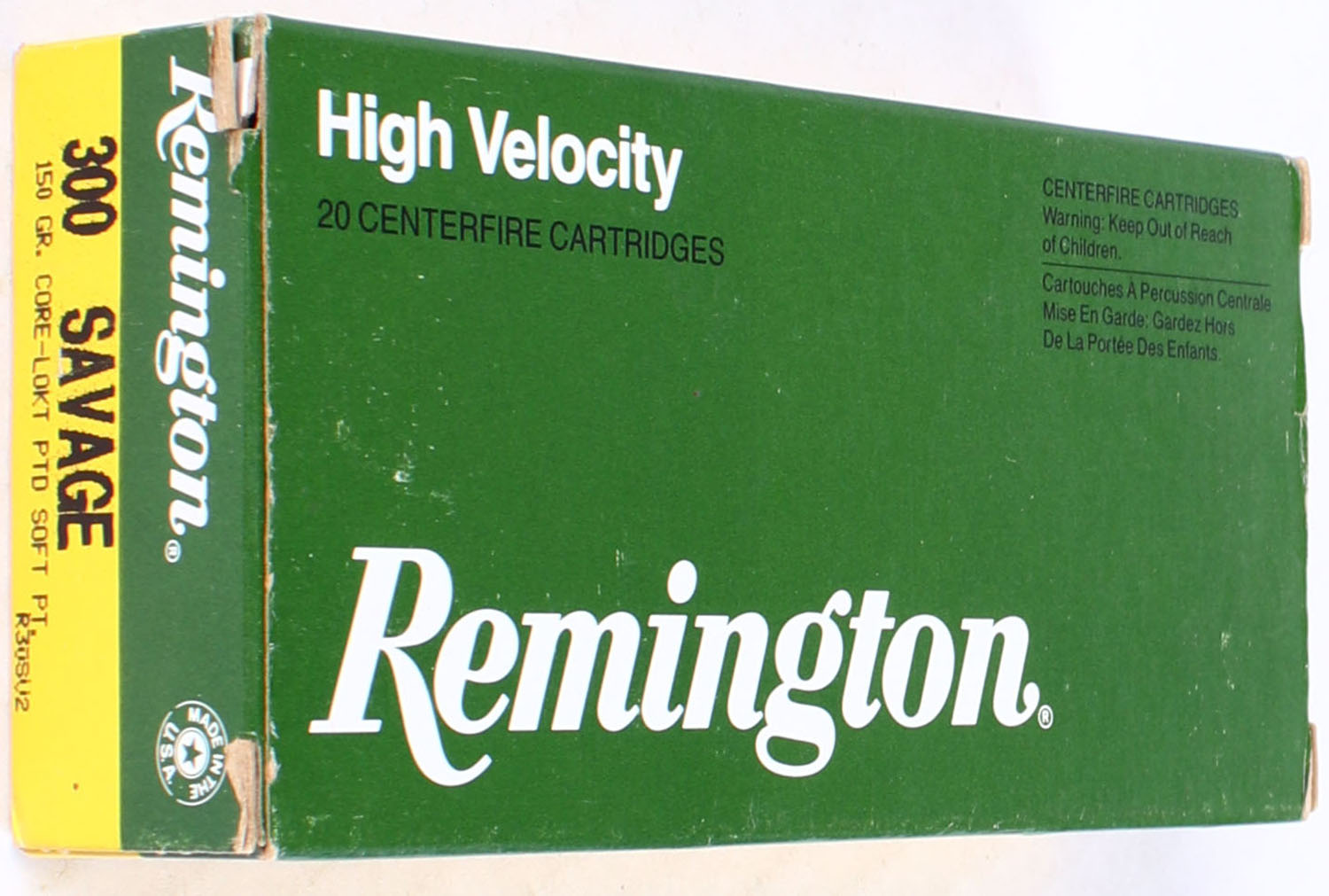 Remington, High Velocity, .300 Savage., 150 Grain Core-Lokt Ptd Soft Pt, Full, 1pc. Yellow, green white & black box, box is solid, ammo is excellent. Grade: Excellent - Value: 20 to 50