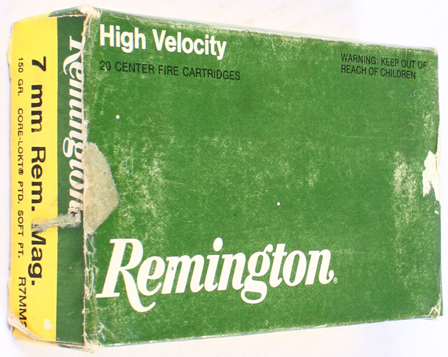 Remington, High Velocity, 7mm Rem Mag., 150 Grain Core-Lokt Soft Point, FULL, 1pc., Green & yellow box, box has edge & corner wear with some scuffing, ammo is excellent. Grade: Very Good + - Value: 16 to 40