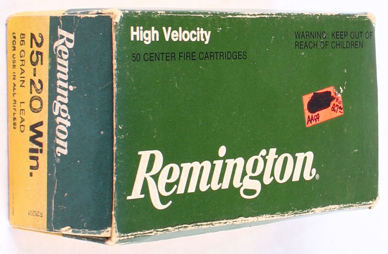 Remington, High Velocity, .25-20 Win., 86 Grain Lead, FULL, 1pc., Green & yellow box, box has edge & corner wear with some scuffing, ammo is excellent. Grade: Very Good - Value: 20 to 50
