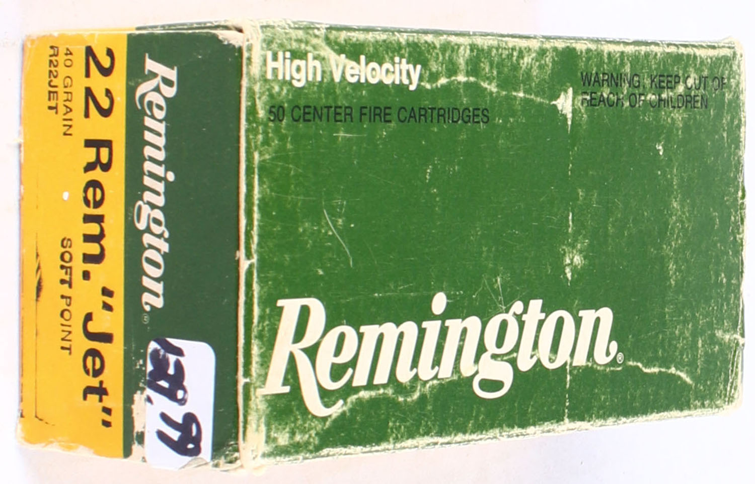 Remington, High Velocity, .22 Rem Jet, 40 Grain Soft Point, Full, 1pc. Yellow, green, white & black box, box has scuffing and edge wear, ammo is excellent. Grade: Very Good ++ - Value: 20 to 50