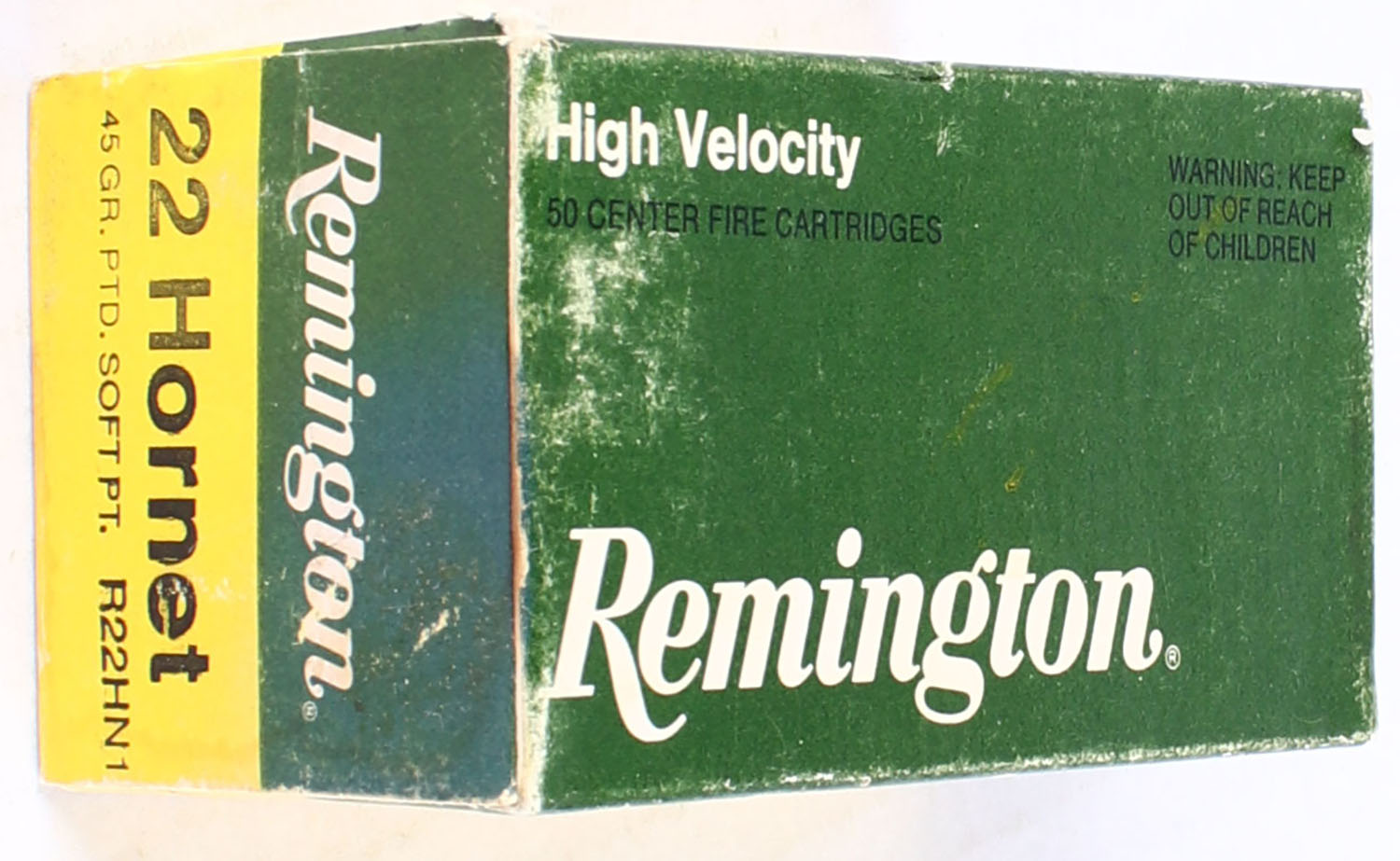 Remington, High Velocity, .22 Hornet, 45 Grain Pointed Soft Point, Full, 1pc. Yellow, green, white & black box, box is very solid with light rub marks, 1 end flap is weak maybe has been cut, ammo is excellent. Grade: Very Good ++ - Value: 20 to 50