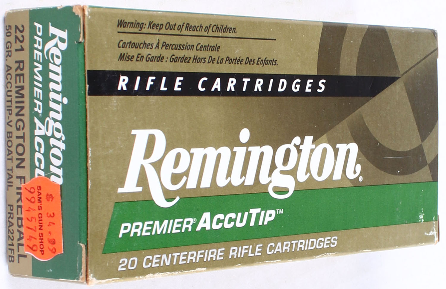 Remington, Premier AccuTip, .221 Remington Fireball, 50 Grain AccuTip-V Boat Tail, Full, 1pc, Gold, green, white & black box, box is very solid, ammo is excellent. Grade: Excellent ++ - Value: 26 to 50