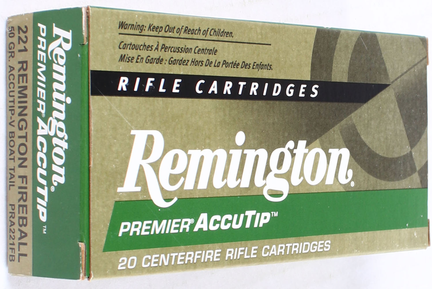 Remington, Premier AccuTip, .221 Remington Fireball, 50 Grain AccuTip-V Boat Tail, Full, 1pc, Gold, green, white & black box, box is very solid, ammo is excellent. Grade: Excellent ++ - Value: 26 to 50