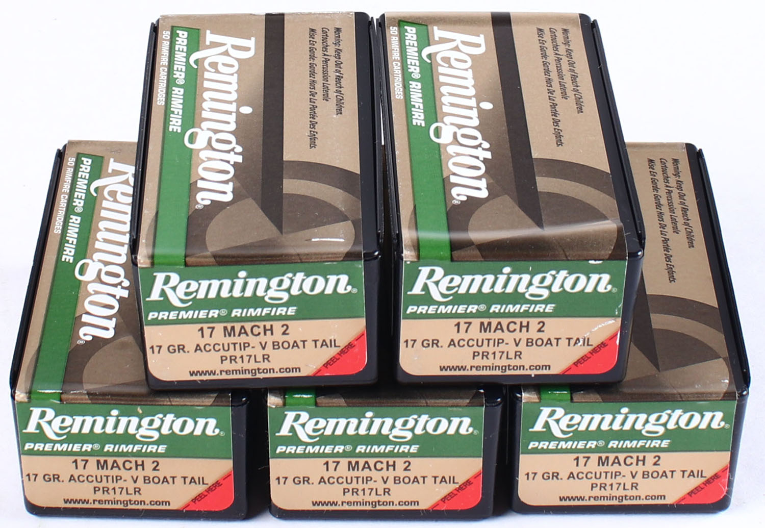Remington, Lot of (5), Premier Rimfire, 17 Mach 2, 17 Grain AccuTip-V Boat Tail, FULL & SEALED, 1pc. Gold, green, white & black boxes, boxes are solid with very nice color. Grade: Excellent - Value: 26 to 50