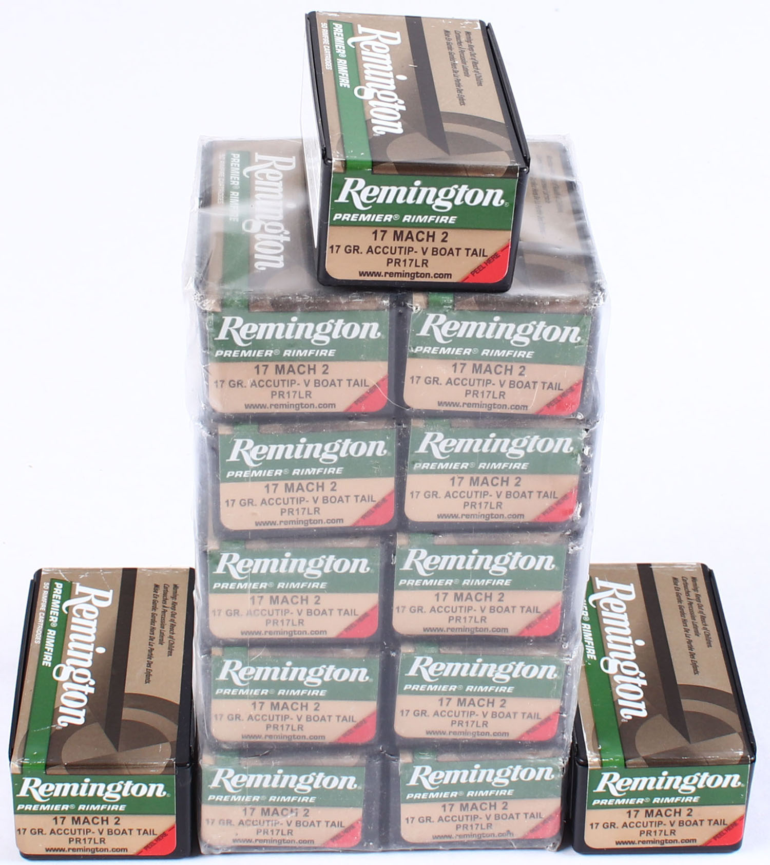 Remington, Lot of (13), Premier Rimfire, 17 Mach 2, 17 Grain AccuTip-V Boat Tail, FULL & SEALED, 1pc. Gold, green, white & black boxes, boxes are solid with very nice color. Grade: Excellent - Value: 60 to 120
