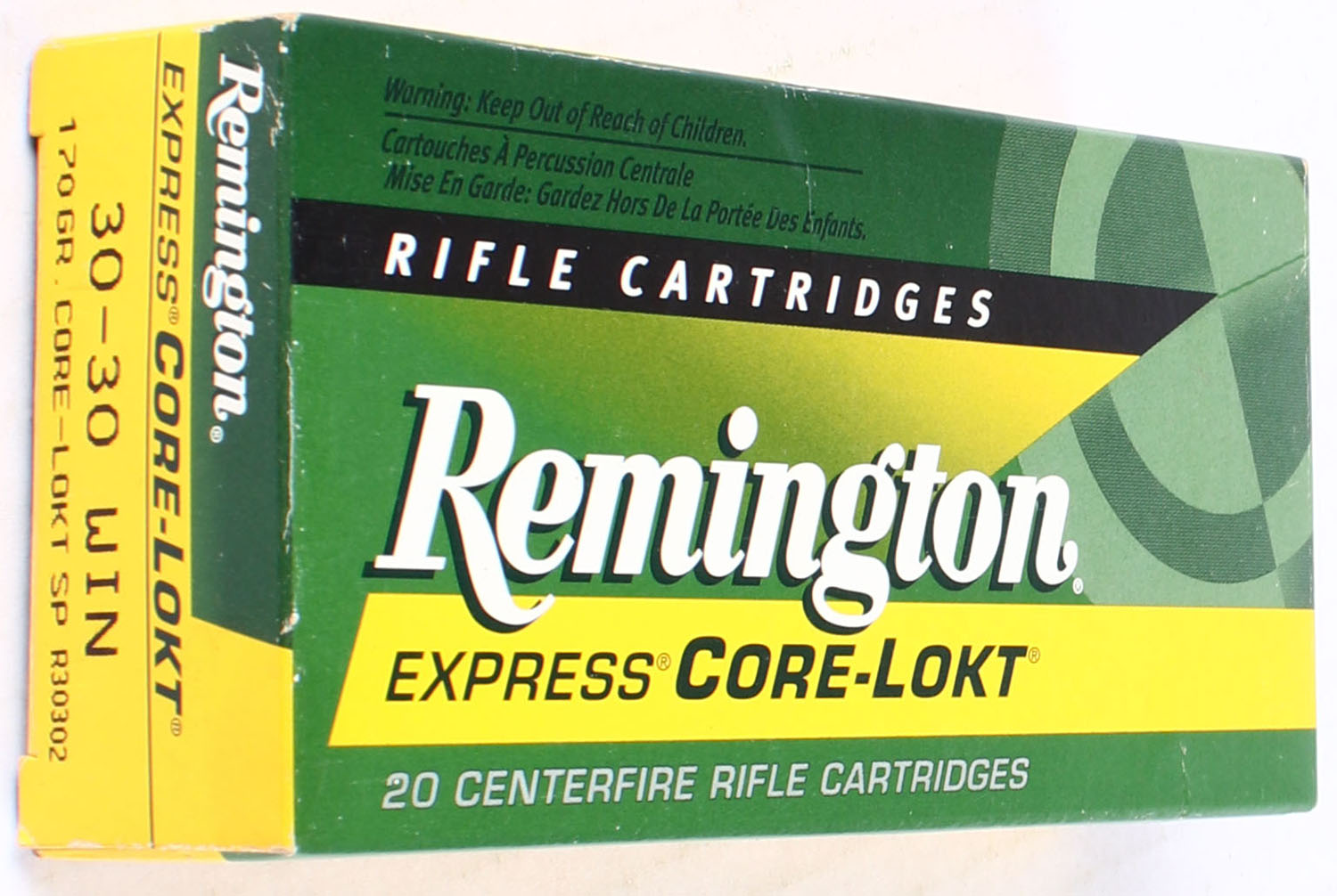 Remington, Express Core-Lokt, .30-30 Win., 170 Grain Core-Lokt Soft Point, 1pc, Full, multi-colored box, box is solid, ammo is excellent. Grade: Excellent - Value: 20 to 50