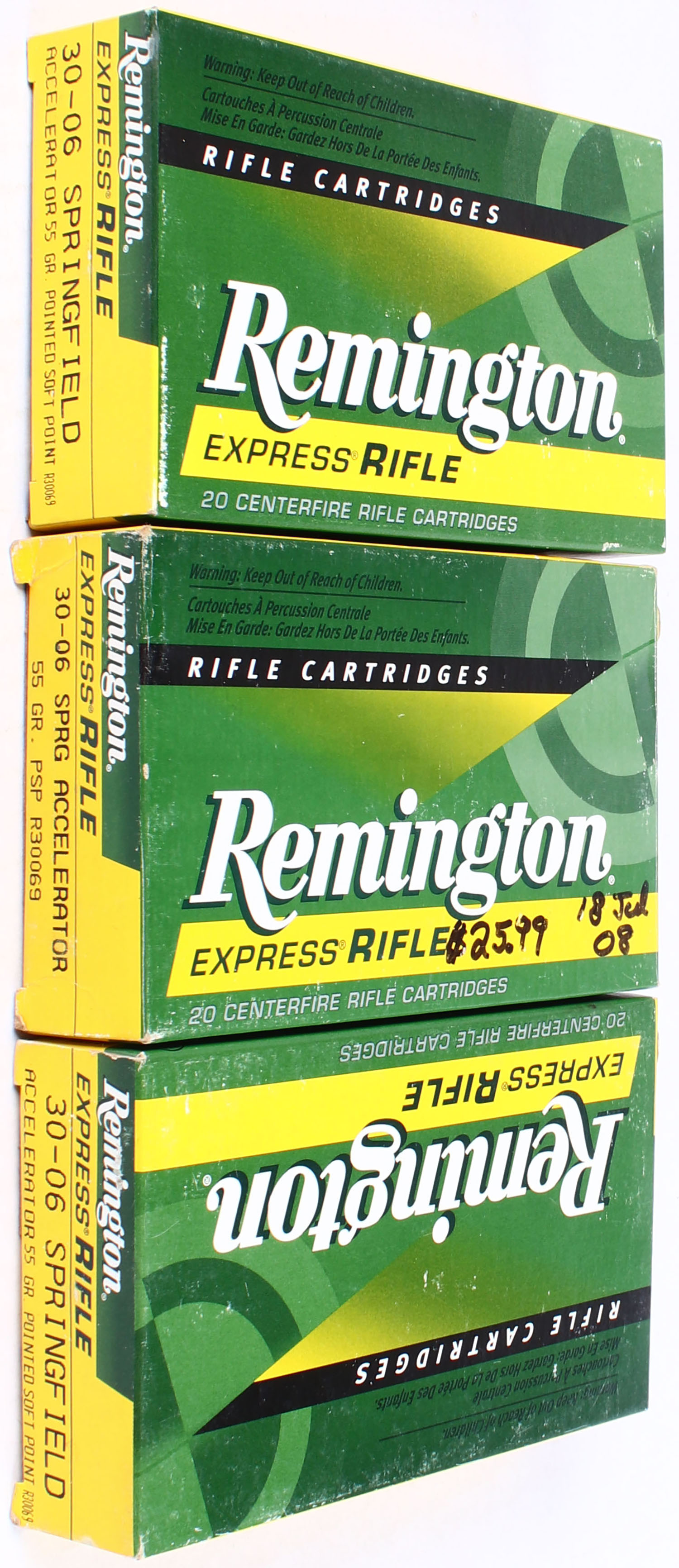 Lot of 3, Remington Express, .30-06 Springfield., (2) Accelerator 55 Grain and (1) 55 grain, Full, Multi-colored boxes, boxes are solid, ammo is excellent. Grade: Excellent - Value: 20 to 60