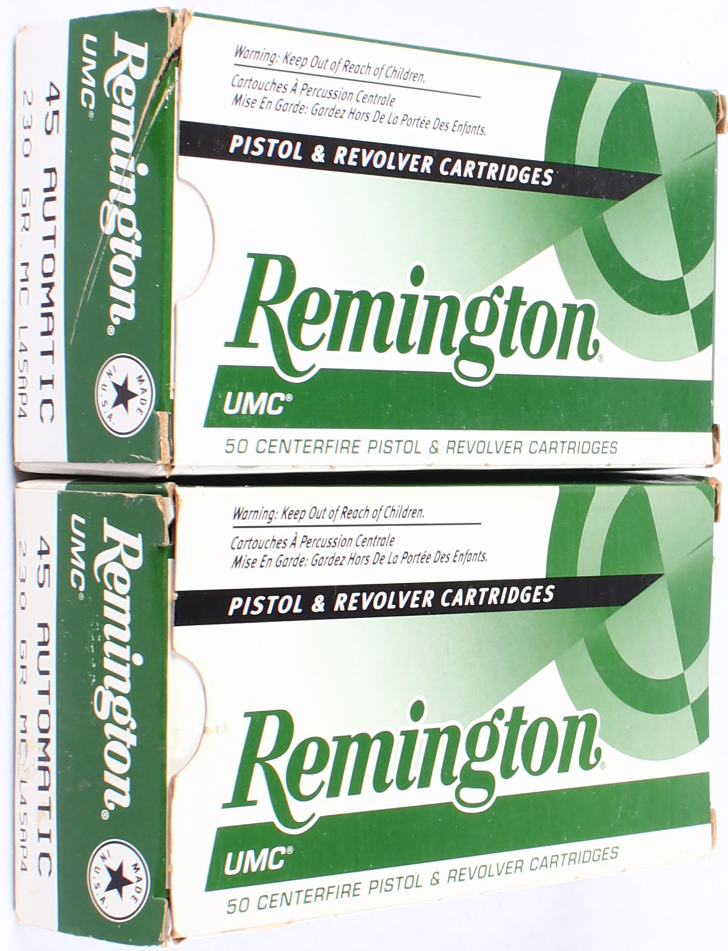 Lot of 2 Remington, UMC, .45 Auto , 230 Grain Metal Case, 1 Full and 1 Partial 29rds., 1pc., green, white & black box, box is solid with great color, end flaps are solid, ammo is excellent. Grade: Very Good ++ - Value: 16 to 50