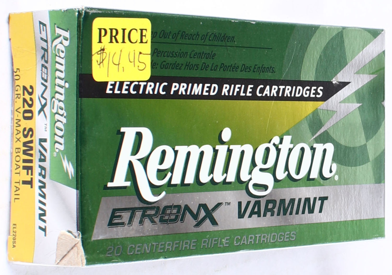 Remington EtronX Varmint, .220 Swift, 50 Grain V-max Boat tail, FULL, 1pc. box is solid with great color. Grade: Excellent ++ - Value: 16 to 40