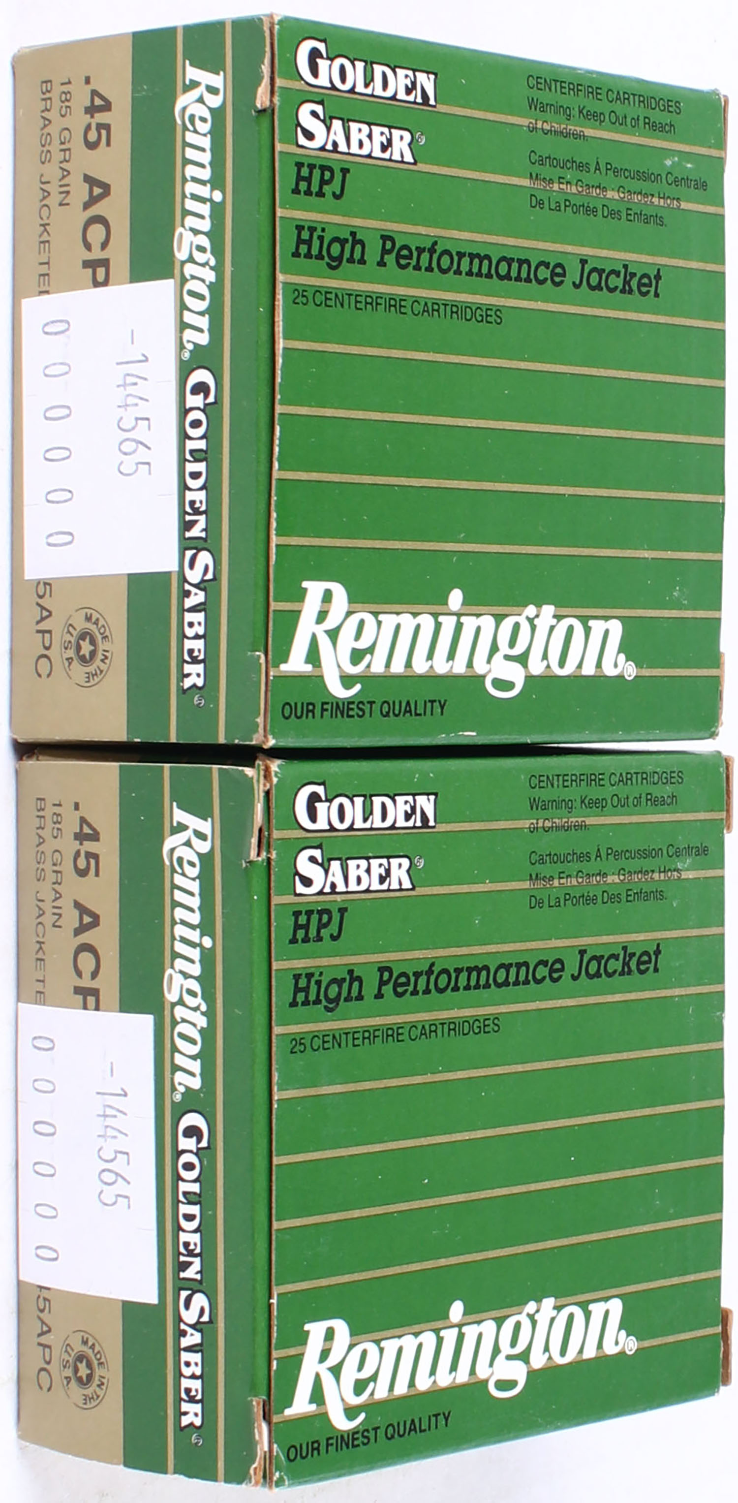 Lot of 2 Remington Golden Saber, .45 ACP, 185 Grain brass Jacketed HP, FULL, 1pc. box is solid with great color. Grade: Excellent ++ - Value: 16 to 40