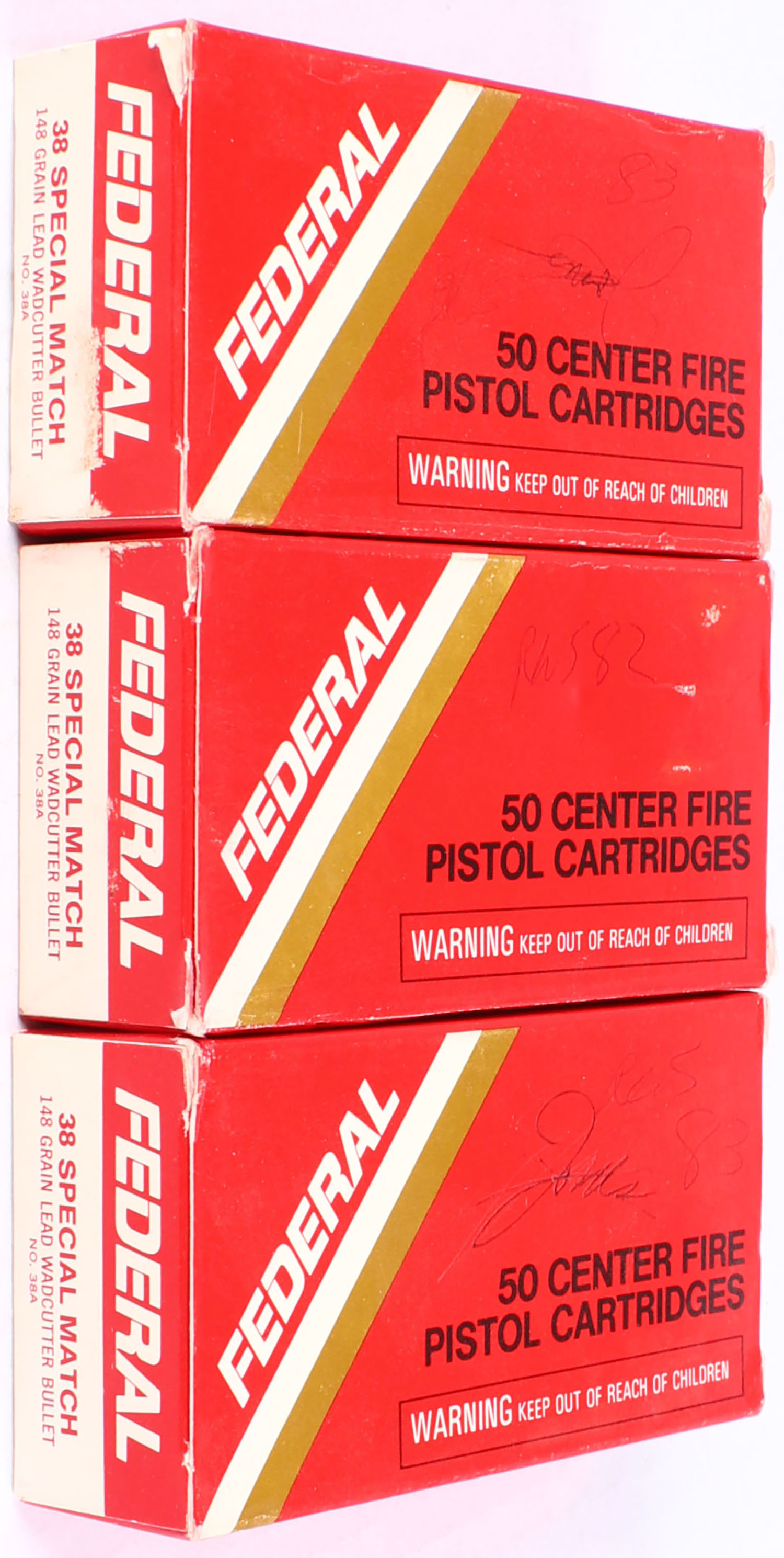 Lot of 3 Federal, 38 Special Match, 148 Grain Lead WC, Full, 1pc. Multi-colored box, box is solid with scuffing, end flaps are solid, ammo is excellent. Grade: Excellent - Value: 20 to 60
