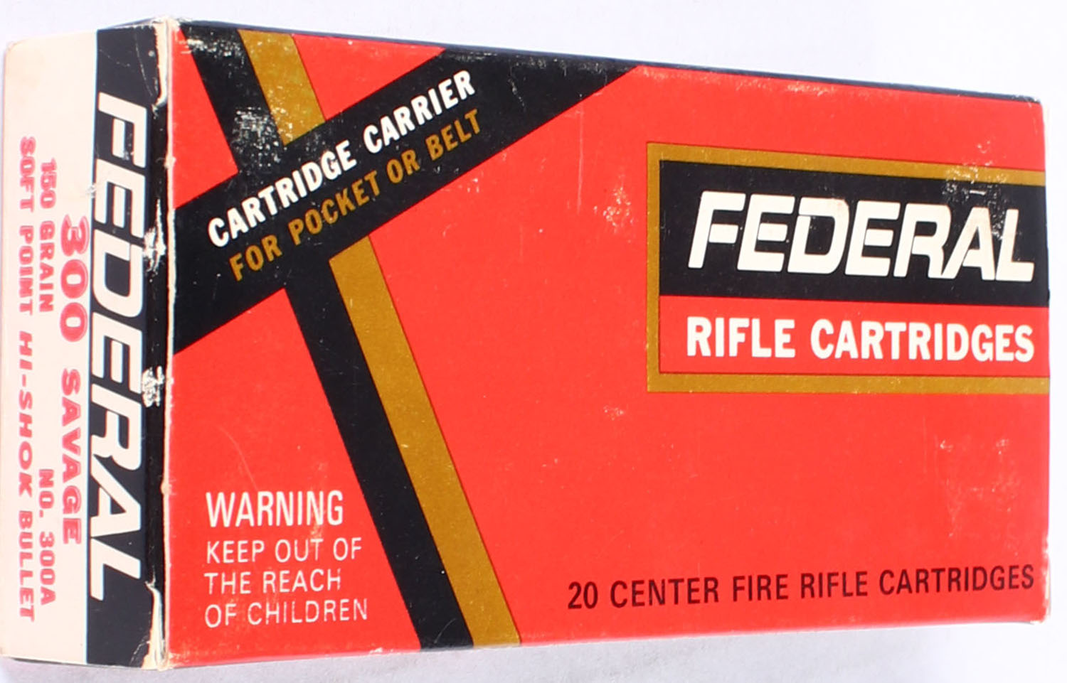 Federal, .300 Sav, 150 Grain SP Hi-shock, Full, 1pc. Multi-colored box, box is solid with scuffing, end flaps are solid, ammo is excellent. Grade: Excellent - Value: 16 to 40