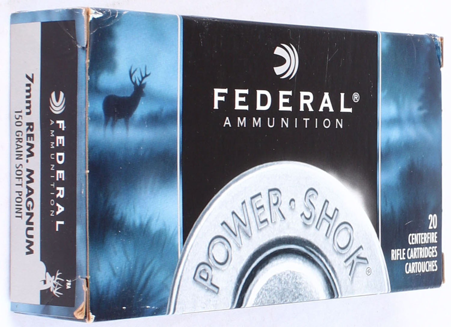 Federal, Power Shok, 7mm Rem Mag., 150 Grain Soft Point, Full, 1pc., multi-colored box, box has edge wear, ammo is excellent. Grade: Excellent - Value: 16 to 40