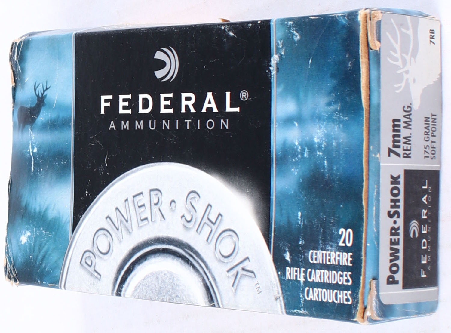 Federal, Power Shok, 7mm Rem Mag., 175 Grain Soft Point, Full, 1pc., multi-colored box, box has edge wear, ammo is excellent. Grade: Excellent - Value: 10 to 40