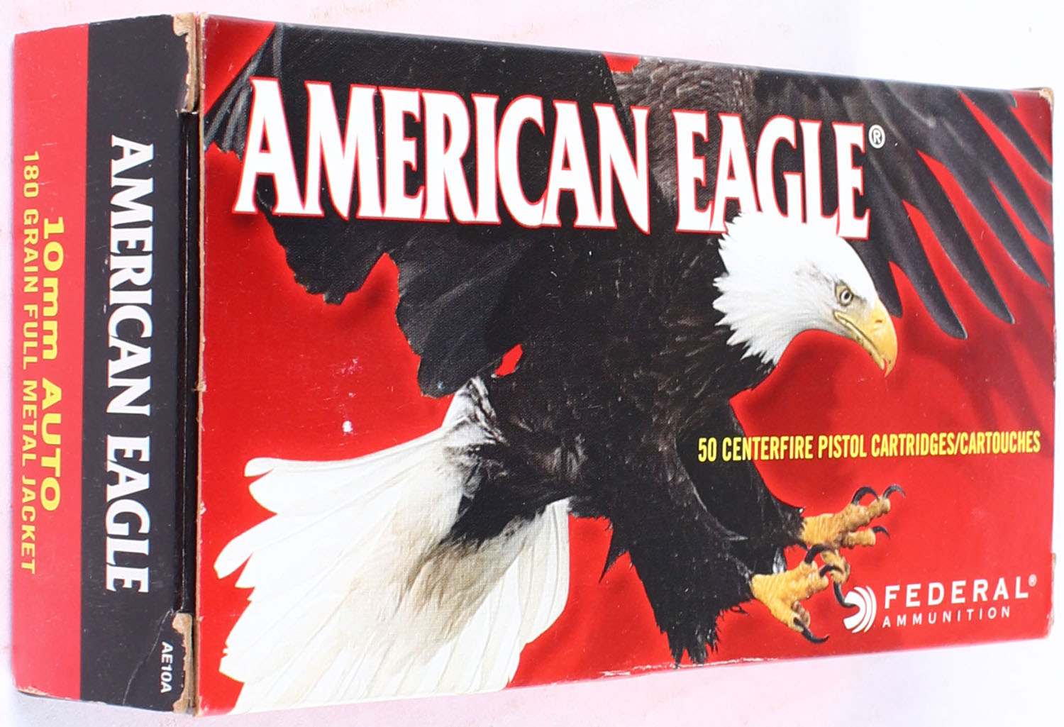 Federal, American Eagle, 10mm Auto, 180 Grain FMJ, Full, 1pc. Multi-colored box, box is solid with great color, end flaps are solid, ammo is excellent. Grade: MINT - Value: 10 to 30