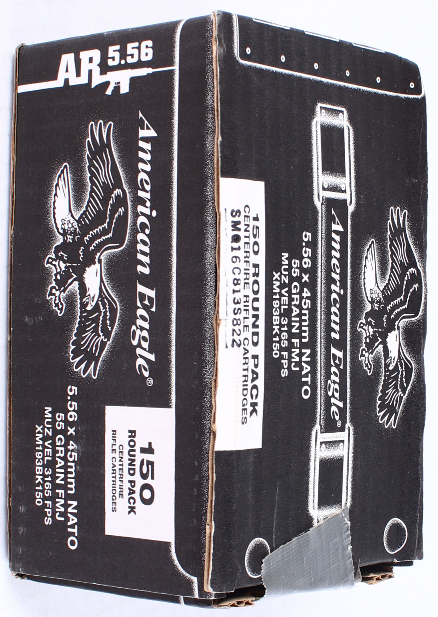 Federal, American Eagle, 5.56x45mm NATO, 150 round pack, 55 Grain FMJ, Full, 1pc. Multi-colored box, box is solid with great color, ammo is excellent. Grade: Excellent - Value: 20 to 50