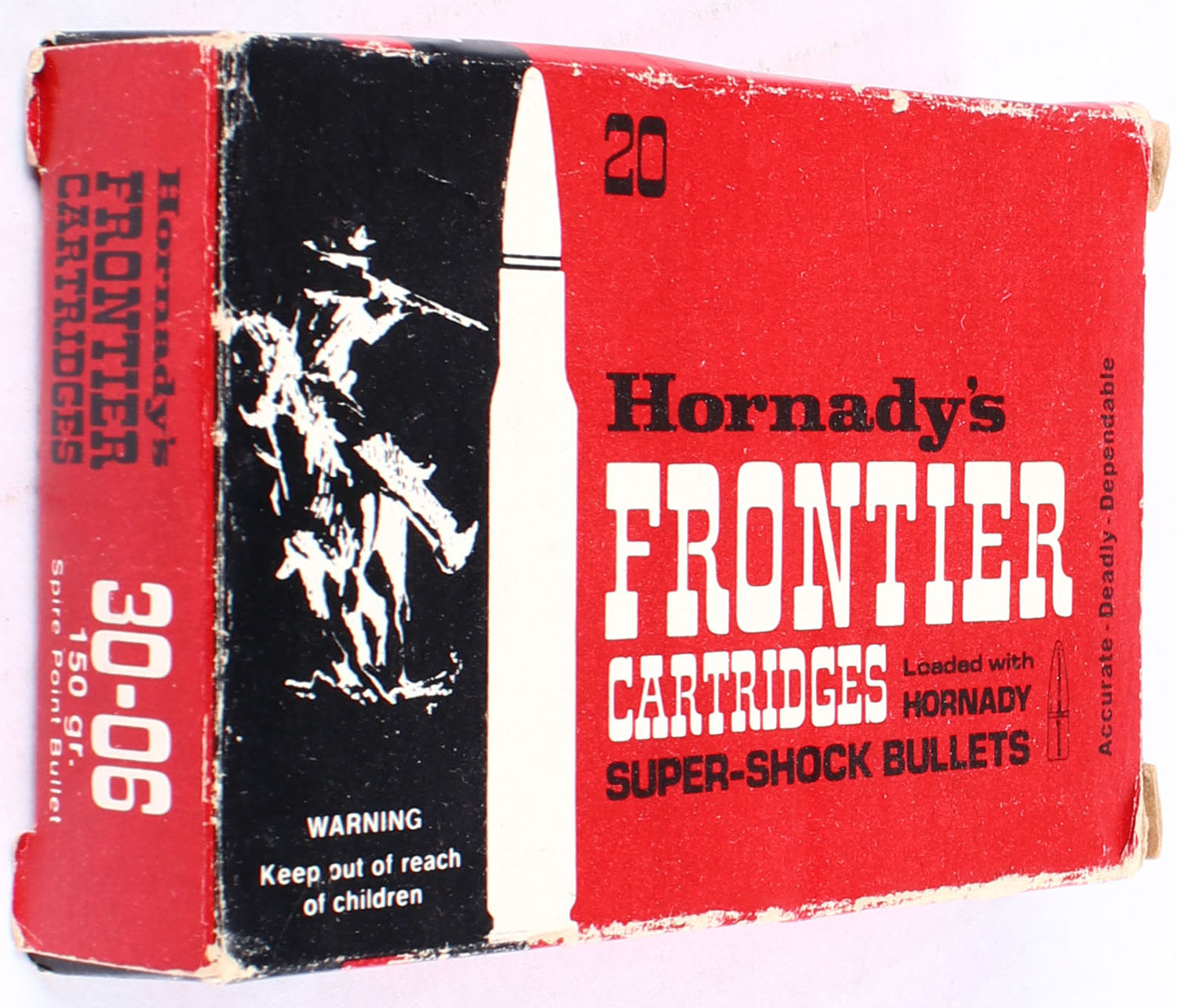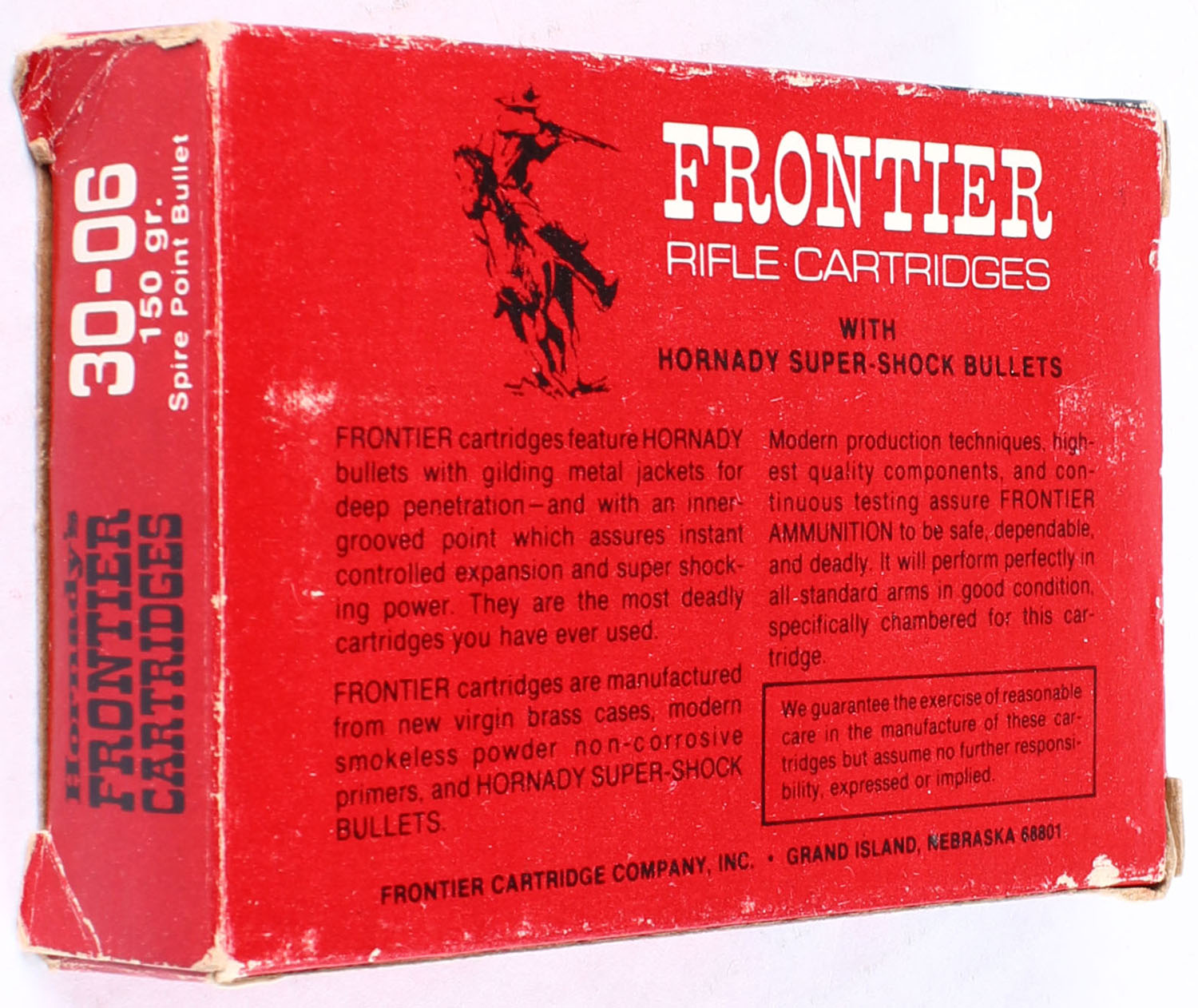 Hornady, Frontier Cartridges, .30-06, 150 Grain Soft Point Bullets, FULL, 1pc. Red black & white box, box is solid with edge & corner wear, end flaps are solid, ammo is excellent. Grade: Very Good ++ - Value: 16 to 40