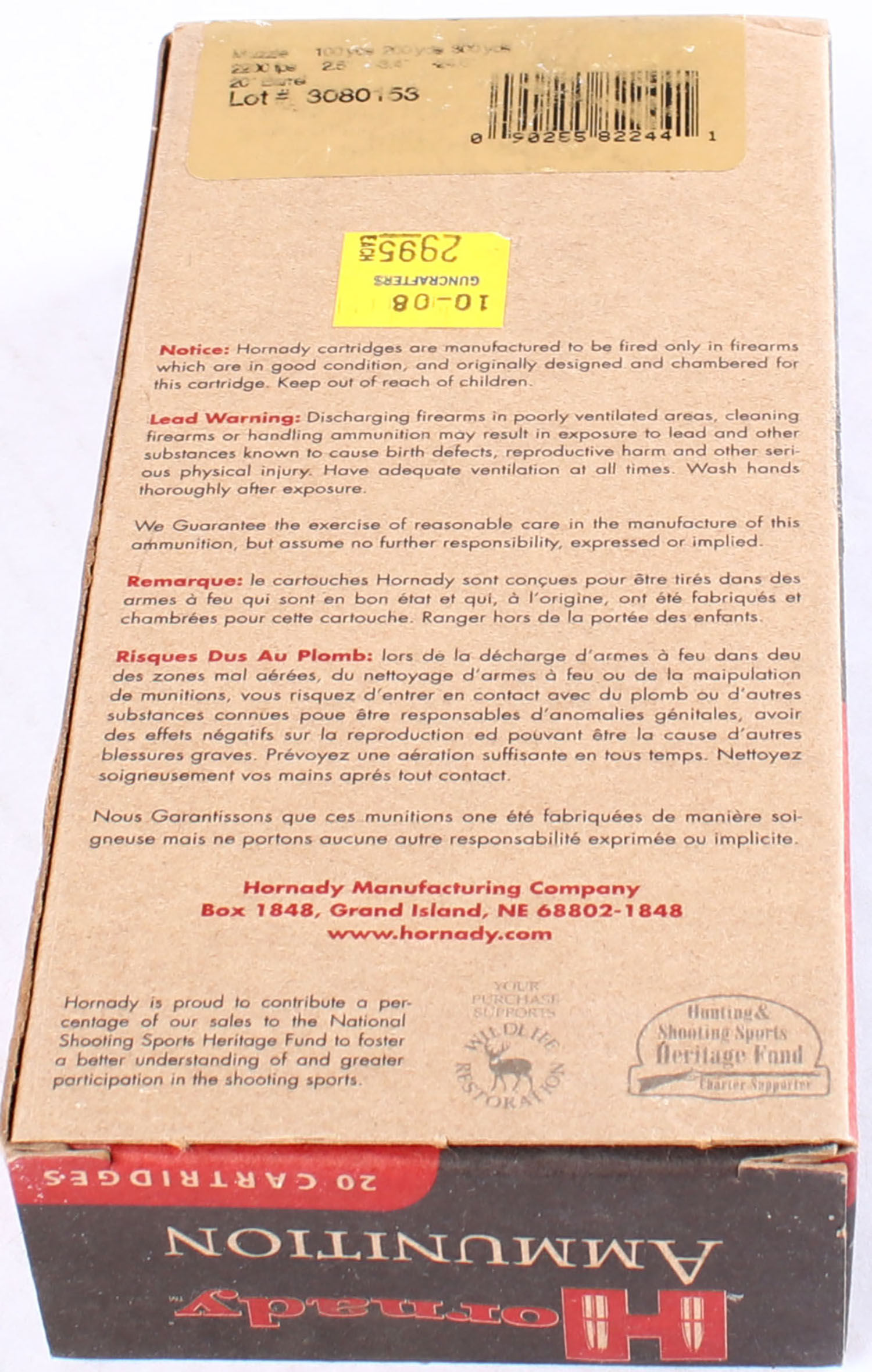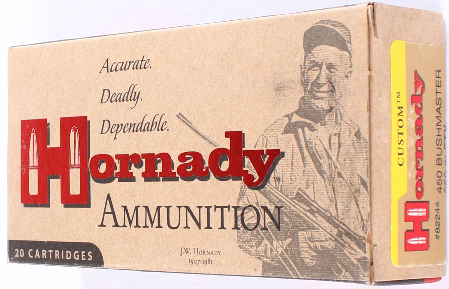Hornady, Custom, 450 Bushmaster, 250 Grain FTX, Full, 1pc. multi-colored box, box is solid, Ammo is excellent. Grade: Excellent ++ - Value: 20 to 50