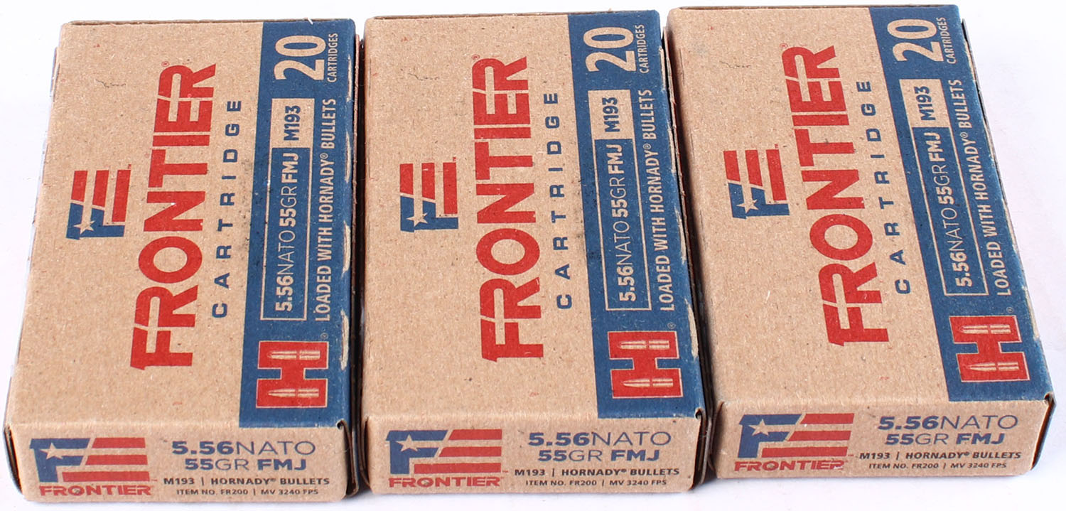 Lot of 3 Hornady, Frontier Cartridge, 5.56 Nato, 55 Grain Full Metal Jacket, FULL & SEALED, multi-colored boxes, boxes are very solid with excellent color. Grade: Excellent ++ - Value: 16 to 40