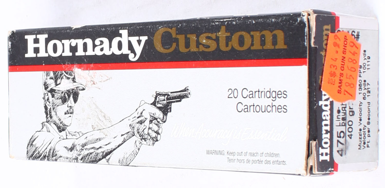 Hornady, Custom, .475 Linebaugh, 400 Grain HP XTP/Mag, Full, 1pc. Gray black & red box, box is solid with excellent color, end flaps are solid, ammo is excellent. Grade: Excellent - Value: 20 to 60