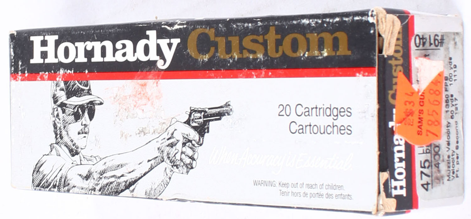 Hornady, Custom, .475 Linebaugh, 400 Grain HP XTP/Mag, Full, 1pc. Gray black & red box, box is solid with excellent color, end flaps are solid, ammo is excellent. Grade: Excellent - Value: 20 to 60