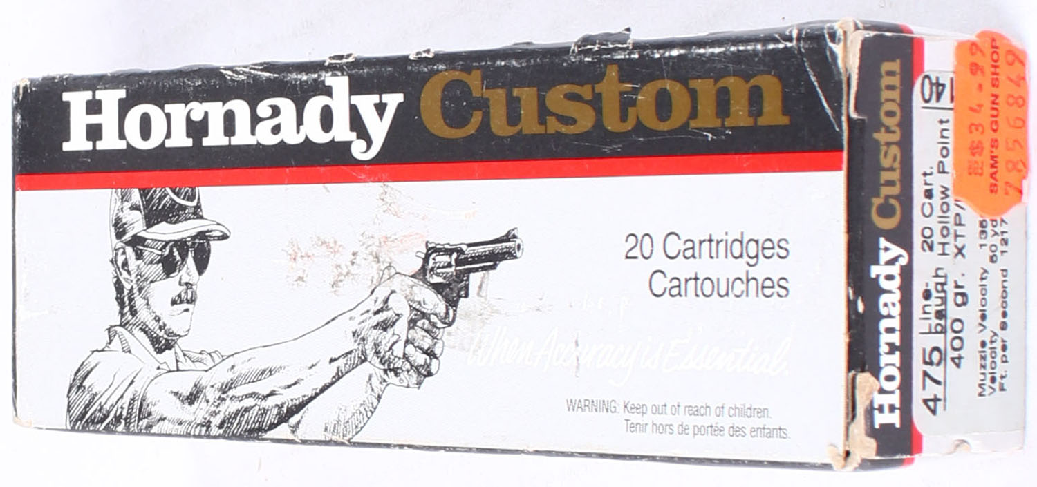 Hornady, Custom, .475 Linebaugh, 400 Grain HP XTP/Mag, Full, 1pc. Gray black & red box, box is solid with excellent color, end flaps are solid, ammo is excellent. Grade: Excellent - Value: 20 to 60