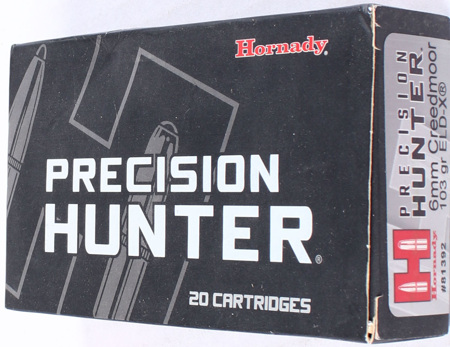 Hornady, Precision Hunter, 6mm Creedmoor, 103 Grain ELD-X, Full, 1pc. multi-colored box, box is solid with excellent color, ammo is mint. Grade: MINT - Value: 20 to 30