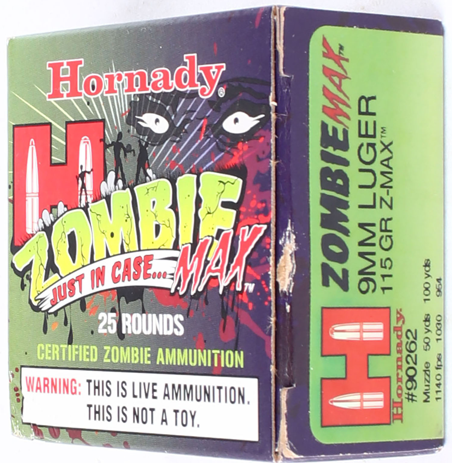 Hornady, Zombie Max, 9mm Luger, 115 Grain Z-Max, Full, 1pc. Multi-colored box, box is very solid with excellent color, ammo is minty. Grade: MINT - Value: 30 to 45