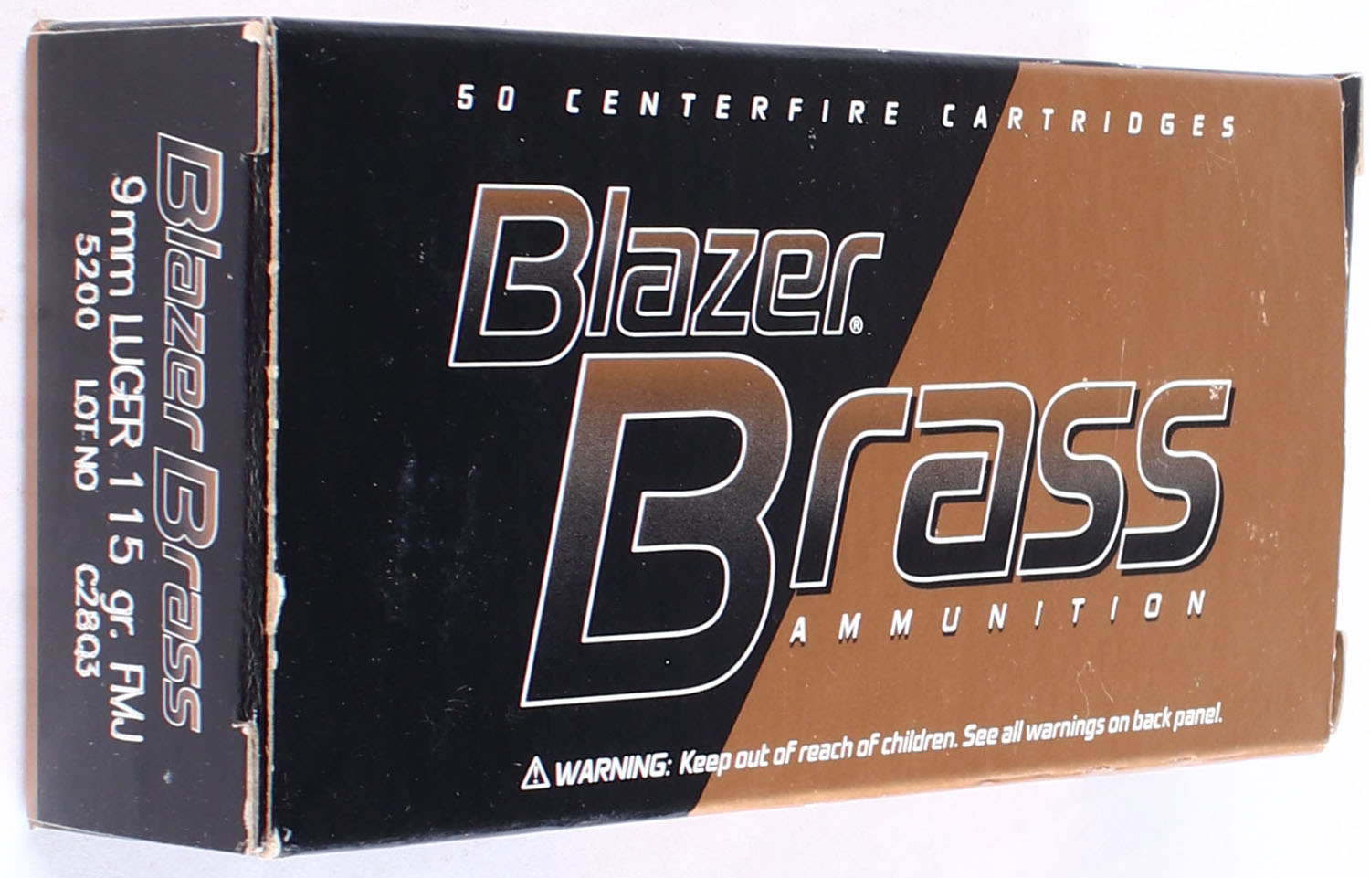 CCI, Blazer Brass, 9mm Luger, 115 Grain FMJ, Full, 1pc. multi-colored box, box is solid with excellent color, Ammo is excellent. Grade: Excellent ++ - Value: 10 to 40