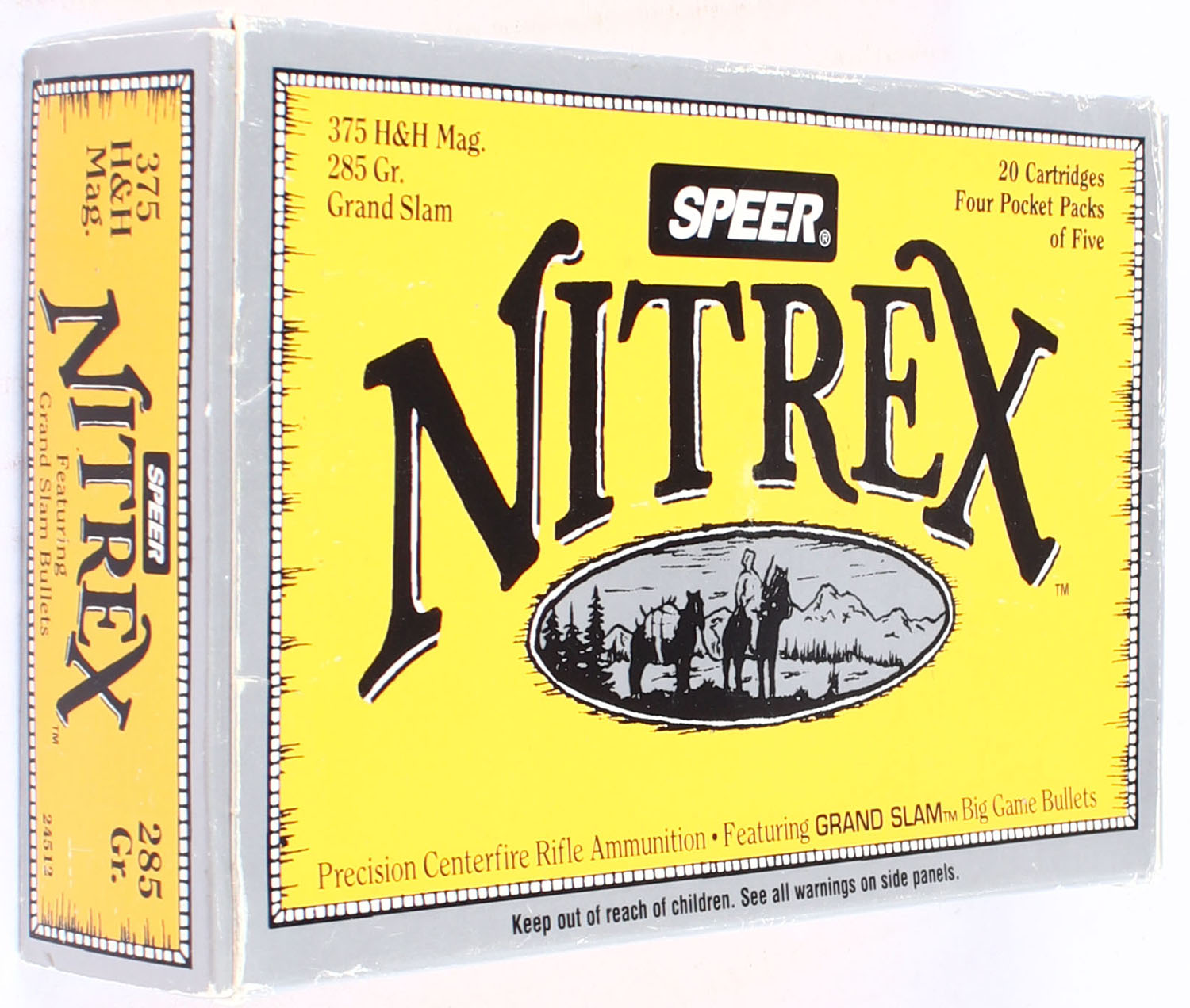 Speer, Nitrex, .375 H & H Magnum, 285 Grain, Full, 1pc. multi-colored box, box is very solid with excellent color, Ammo is excellent. Grade: Excellent ++ - Value: 20 to 80