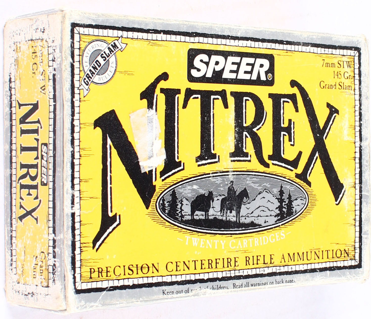 Speer, Nitrex, 7mm STW, 145 Grain, Partial 14rds, 1pc. multi-colored box, box is solid with edge & corner wear, Ammo is excellent. Grade: Very Good ++ - Value: 20 to 40