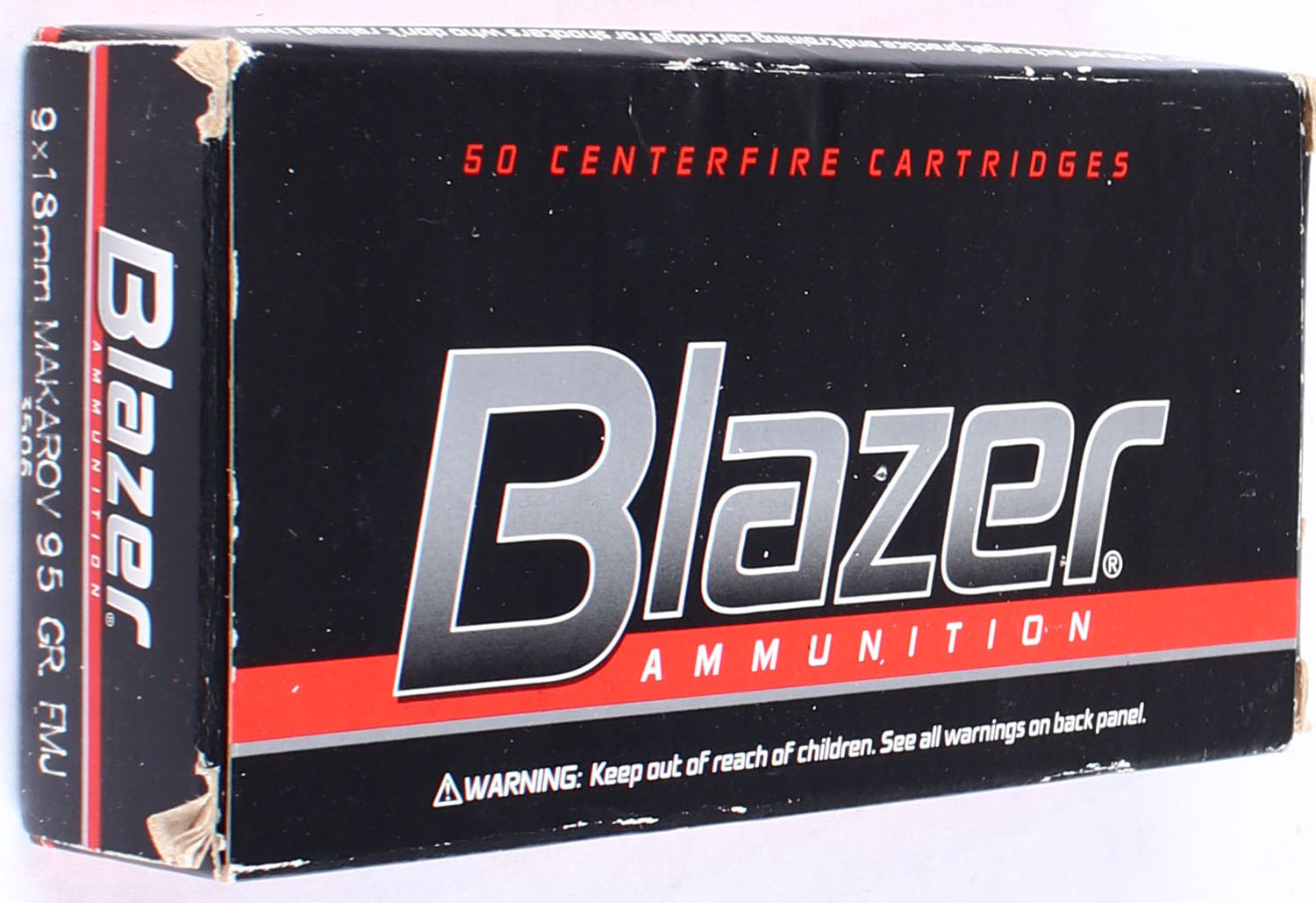 CCI, Blazer, 9 x 18mm Makarov, 95 Grain FMJ, Full, 1pc. multi-colored box, box is solid with excellent color, box has some shelf wear, Ammo is excellent. Grade: Excellent - Value: 20 to 80