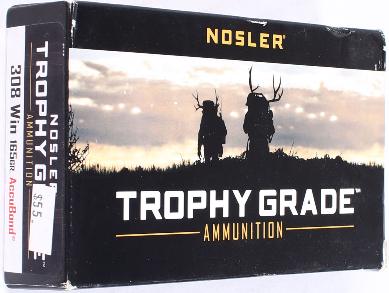 Nosler, Trophy Grade, .308 Win., 165 Grain AB, Full, 1pc. multi-colored box, box is solid, with excellent color, Ammo is excellent. Grade: Excellent ++ - Value: 20 to 50
