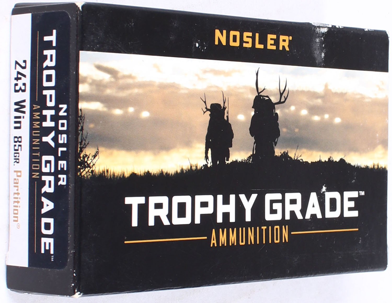 Nosler, Trophy Grade, .243 Win., 85 Grain Partition, Full, 1pc. multi-colored box, box is solid, with excellent color, Ammo is excellent. Grade: Excellent ++ - Value: 20 to 50