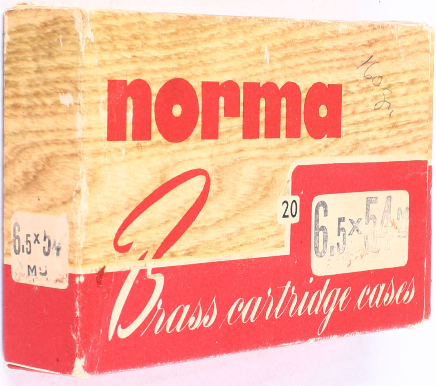 Norma, 6.5 x 54 MS, 160 Grain, Partial 18rds., 1pc. Multi-colored box, box has edge & corner wear, ammo is very good. Grade: Very Good - Value: 20 to 40