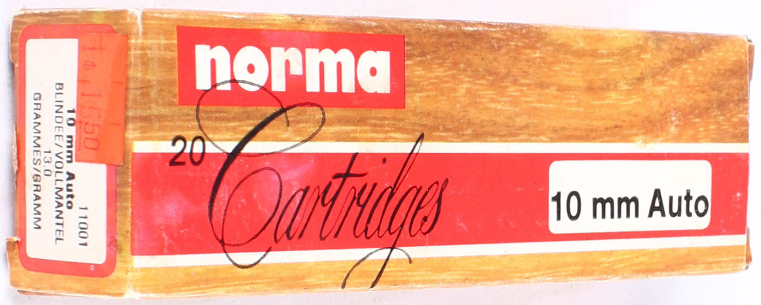 Norma, 10mm Auto, 200 Grain Full Jacked Truncated Cone, Full, 1pc. Multi-colored box, box is very solid, ammo is excellent. Grade: Excellent - Value: 20 to 30