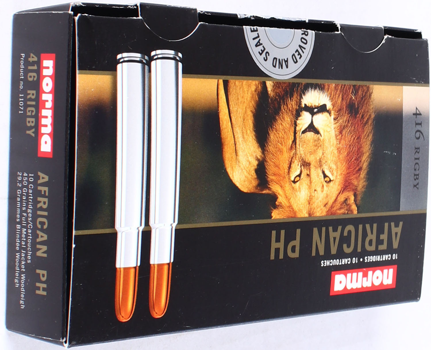 Norma, African PH, .416 Rigby, 450 Grain Full Metal Jacket, Full, 1pc., Multi-colored box, box is very solid with excellent color, ammo is mint. Grade: Excellent ++ - Value: 40 to 100