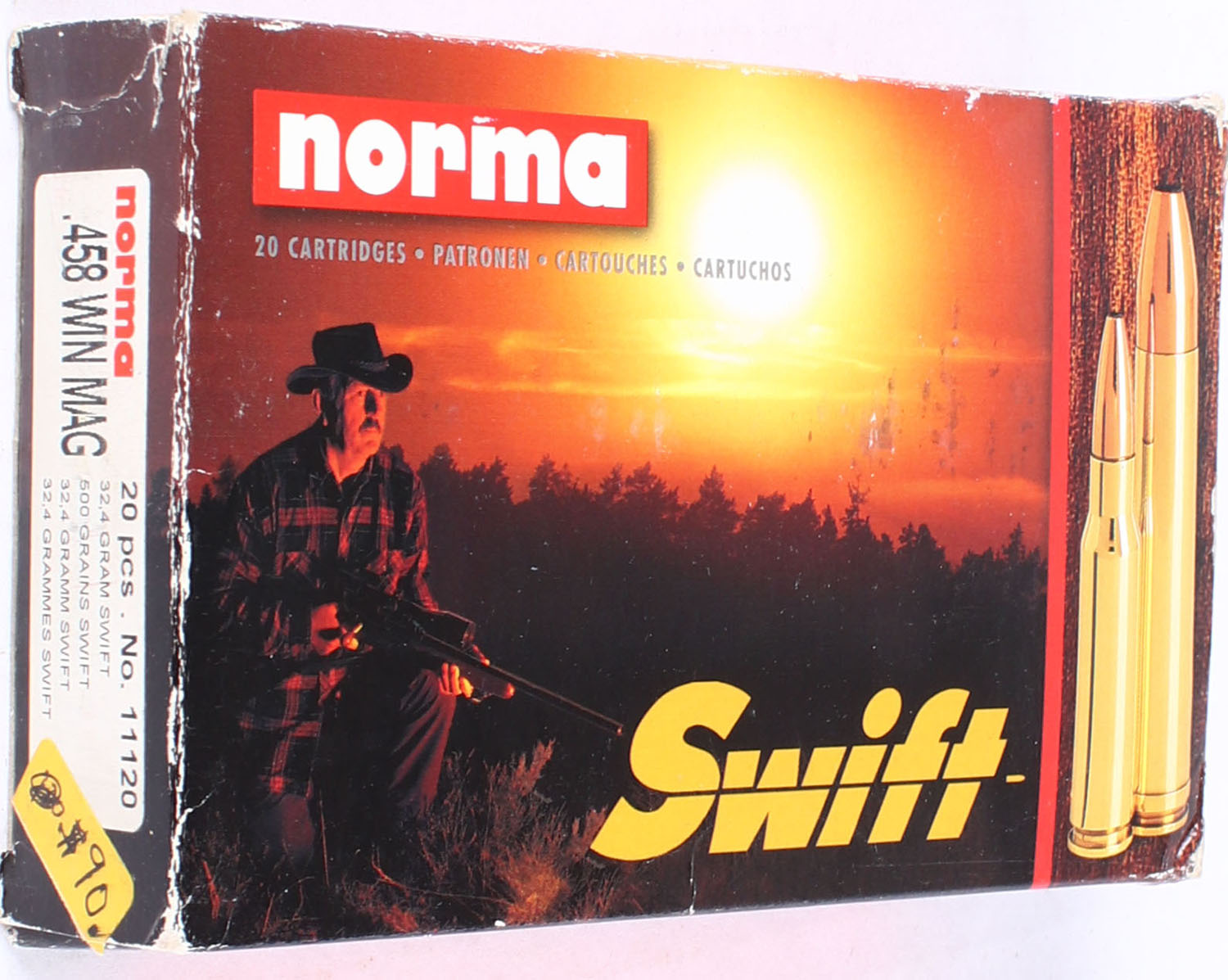 Norma, Swift, .458 WIN. Mag., 500 Grain Swift, Full, 1pc. Multi-colored box, box is solid with light corner wear, ammo is mint. Grade: Excellent - Value: 40 to 100