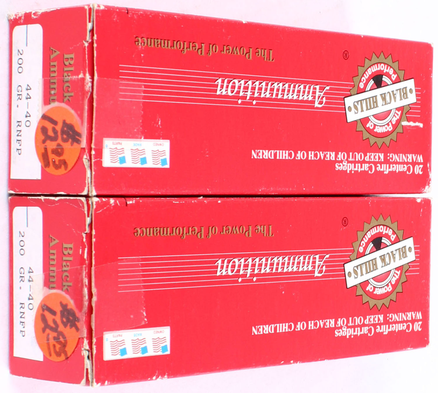 Black Hills, Lot of (2) .44-40, 200 Grain RNFP, Full, 1pc., Red & white boxes, boxes are very solid with corner wear & writing to boxes, ammo is excellent. Grade: Excellent - Value: 80 to 120